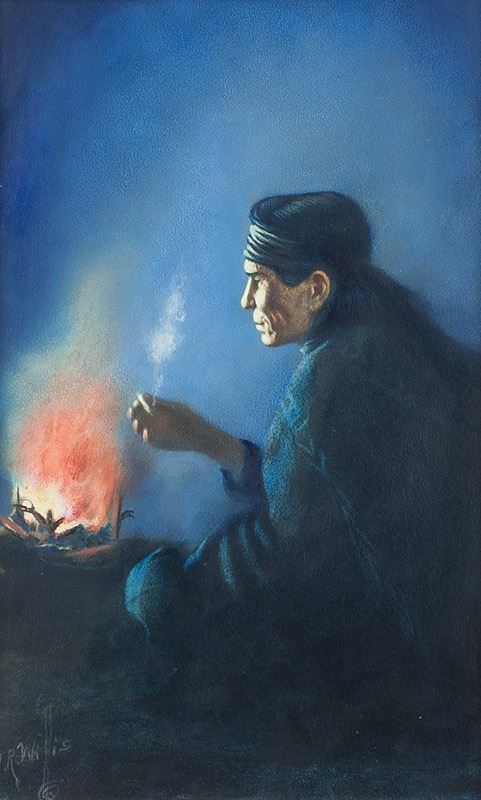 To the unaided eye, this piece is in very good condition. Inspection under ultraviolet light shows normal fluorescence of artist's pigments. There is a signature on the lower left. The piece is in a semi-ornate gold frame with a blue velvet panel and is under glass. The frame is in very good condition and the piece has not been examined out of the frame. Verso: "Renaissance Gallery" sticker and informational blurb about the artist.