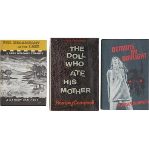 <B>J. Ramsey Campbell</B></I>. <B>Three First Editions</B></I>, including: <B><I>The Inhabitant of the Lake and Less Welcome Tenants</B></I></B></I>. Sauk City, Wisconsin: Arkham House, Publishers, 1964. Twelvemo. 207 pages. Illustrated endpapers. Black cloth with gold spine titles. [and:] <B><I>Demons by Daylight</B></I></B></I>. Sauk City, Wisconsin: Arkham House, Publishers, 1973. Octavo. 153 pages. Black cloth with gold spine titles. [and:] <B><I>The Doll Who Ate His Mother</B></I></B></I>. New York: The Bobbs-Merrill Company, Inc., 1976. 209 pages. Red binding with silver spine titles. Overall, books and dust jackets are fine. Heavily influenced by H. P. Lovecraft, and mentored by August Derleth, British writer John Ramsey Campbell (b. 1946) is considered one of the preeminent authors of horror fiction. <I>From the Robert and Diane Yaspan Collection.</B></I><BR><BR><b>Shipping:</b> Books & Catalogs (<a target="_blank" href="http://www.heritageauctions.com/common/shipping.php">view shipping information</a>)