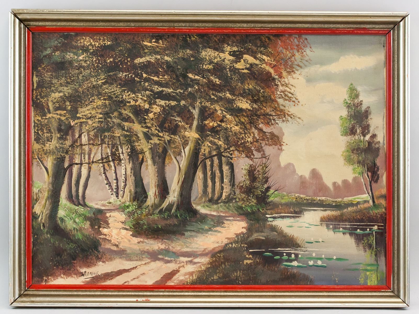 Oil on canvas, framed. Featuring quiet landscape scene with a trail splitting in two on the left and a calm river on the right, dotted with lily pads. Signed "J. Rierisuiyk" on the bottom left corner. 49 x 69 cm (19.25 x 27 in), Frame: 58 x 78 cm (22.75 x 30.75 in). PROVENANCE: This lot carries limited provenance from a Private German collection