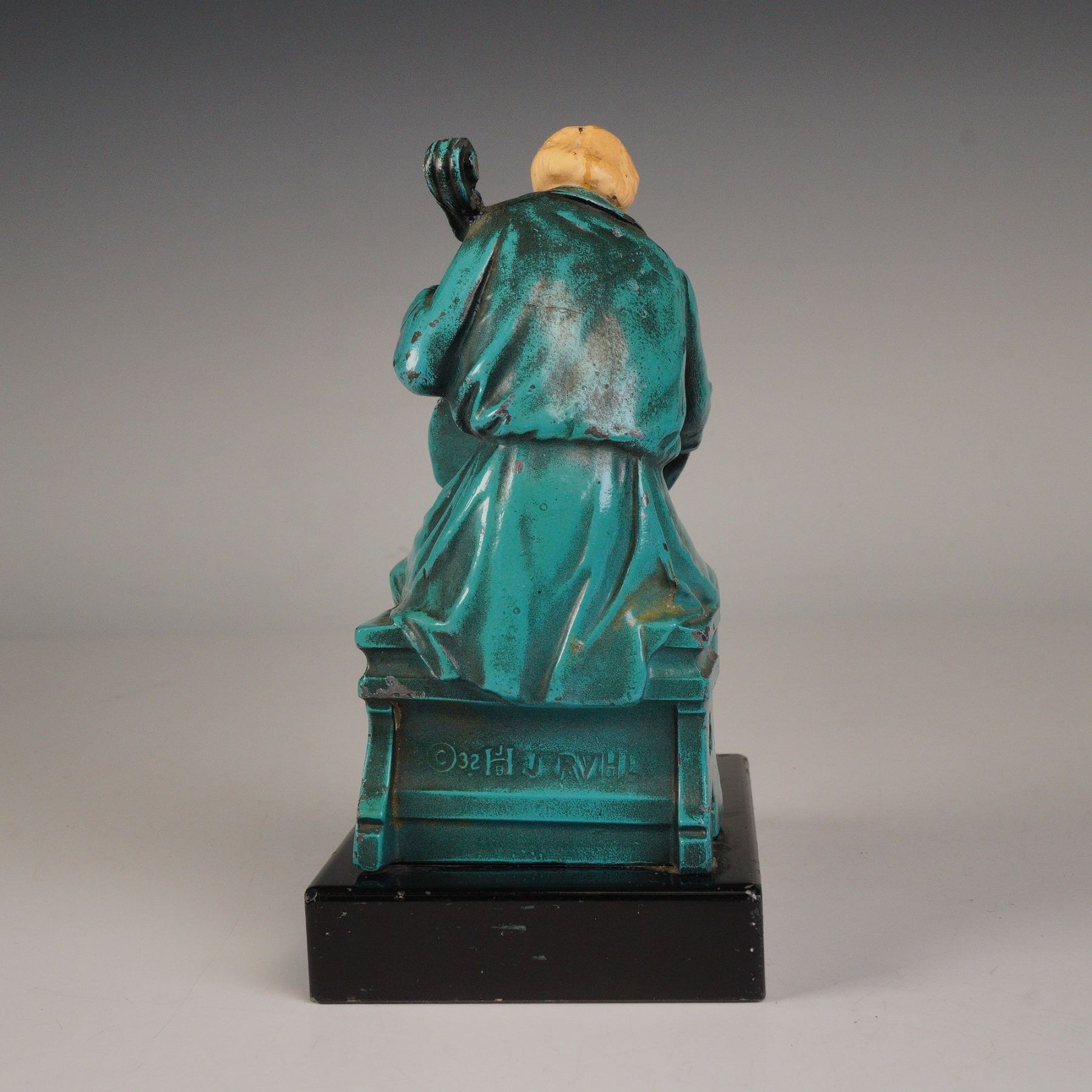 Decorative metal bookend depicting a seated cellist, designed by sculptor J. Ruhl and dated 1932. The figure is rendered in an expressive Art Deco style, showing a musician absorbed in performance, with patinated green-blue finish and contrasting ivory-toned head. The work rests on a polished black marble base, adding visual weight and balance. The piece is impressed copyright 1932 J. Ruhl on the reverse and likely produced by the J.B. Hirsch Foundry, known for high-quality metalwork during the early 20th century. A refined sculptural accent combining artistry and craftsmanship.