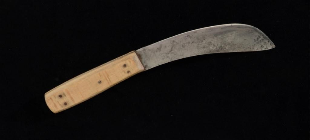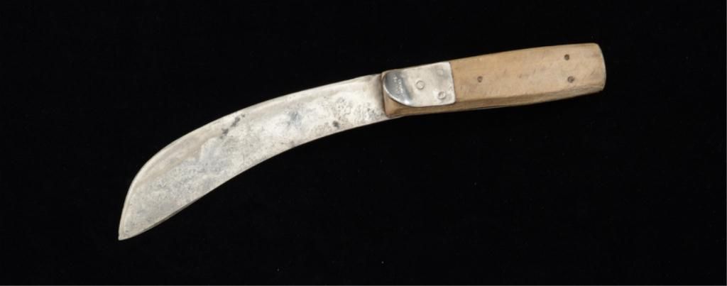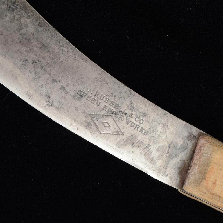 J. Russell & Co. Green River Works skinning knife approx. 10” overall with an approx. 6” blade, five pin wood grips in overall good condition showing some slight sharpening and scattered old points of erosion from use;interesting metal thumb rest on right side of grips marked “Russell Pat. Pend.” Est.: $100-$200.