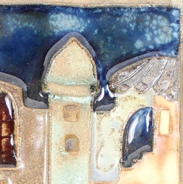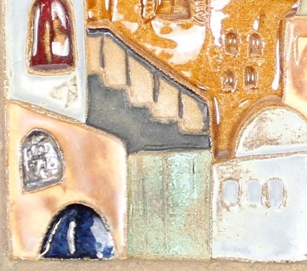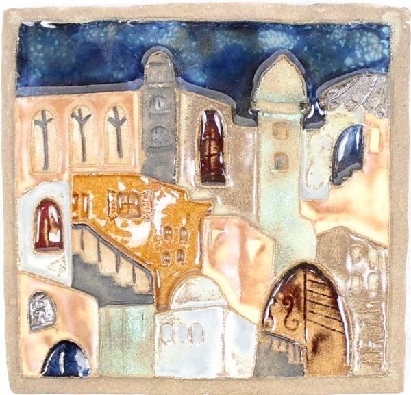 J. Ruth Faktor Mid Century Ceramic Pottery Tile, measures 6'' square, FYI: ''Ruth Faktor was born in Ramat-Gan, Israel in 1937. She studied ceramics with Israeli's sculptor, A. Doctor and Z. Guri. From 1973 to 1977 Ruth studied at the Ramat-Gan Art School where she specialized in sculpture and modern art. Her studio is near Tel Aviv, Israel. A beauty of Ruth's ceramic tiles is in the many textures and finishes that each piece displays. In addition to the themes of family and friendship, she also depicts ancient Israeli cities in her artwork''