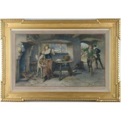 Lot # 783 J. SCOTT (19th Century) PROTECTING THE DEER. Mezotint on paper scene shows young girl protecting a small deer from a hunter with spear that has entered through doorway. Colorful scene housed in a fine gesso decorated gilt frame. SIGHT SIZE: 21-1/4” x 33-1/2”. CONDITION: Good. 9-99271 (150-250)