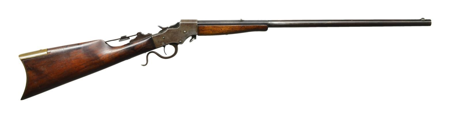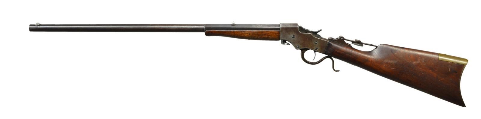 Cal. 32 Long RF. S# F47. Rnd. to oct. 22" bbl. w/ blade front, fixed rear & aperture disk tang sight. Takedown action. Walnut stock set w/ replacement brass crescent buttplate. CONDITION: fair blue fading to brown w/ some silvering at mid section & marks. Action has brown patina appearance w/ peppery oxidation. Screws show distortion. Sanded & refinished wood has light handling marks; one notch where tang sight rests. Replacement brass buttplate has mustard patina & marks. Good bore showing light frosting, but visible rifling. (22-6246/MD). CURIO. $150-250.