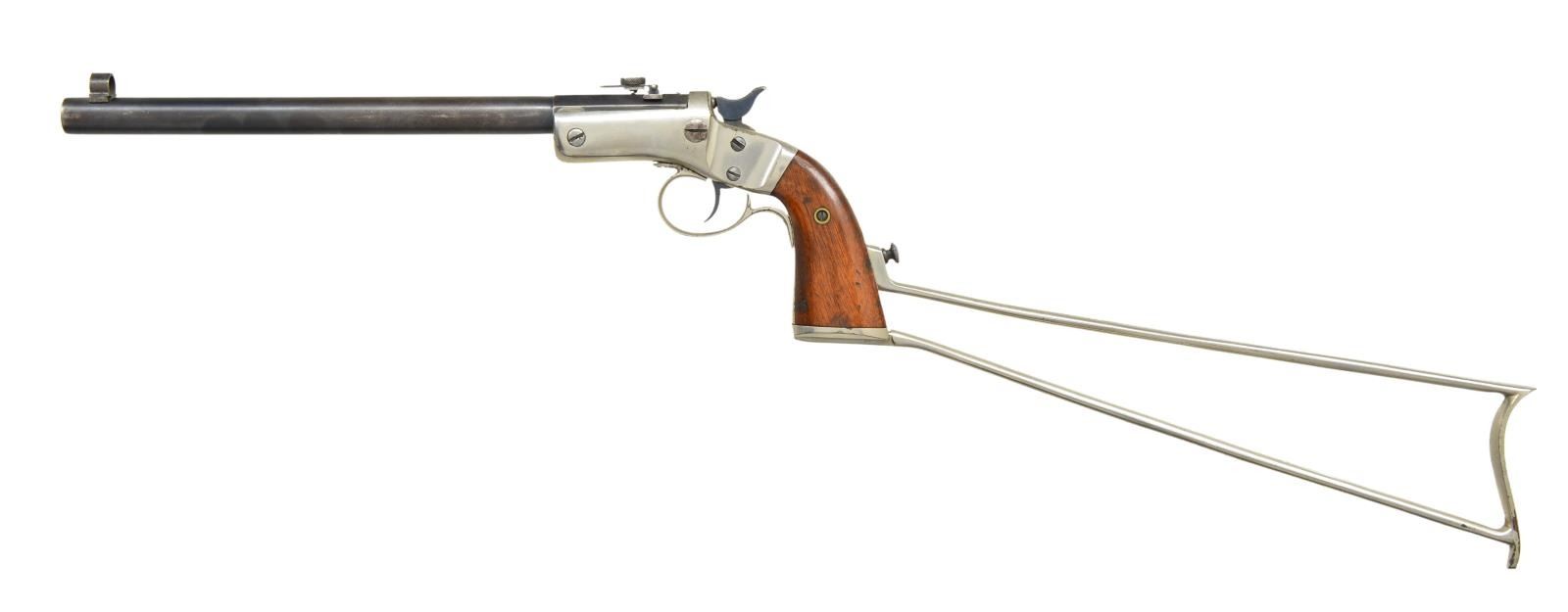 PISTOL. Cal. 22 LR. S# 22543 (mfg. 1896-1916). Matching numbered 9 7/8" bbl. w/ combination globe front & folding combination rear sights. Nickel finished iron frame w/ conventional trigger & triggerguard. 2 Piece walnut grips w/ matching number pencil written on back of right panel. UNATTACHED ACCESSORIES: matching numbered nickel plated shoulder stock. CONDITION: Fair blue fading to brown/gray patina w/ pinprick oxidation & muzzle wear. Good nickel showing areas of peeling finish along edges & notable area on backstrap. Fair worn bore w/ areas of pitting. (22-5773/MD). CURIO. $500-700.