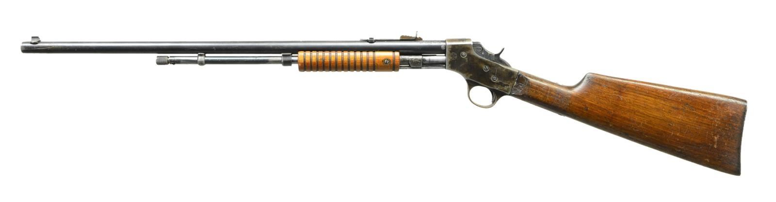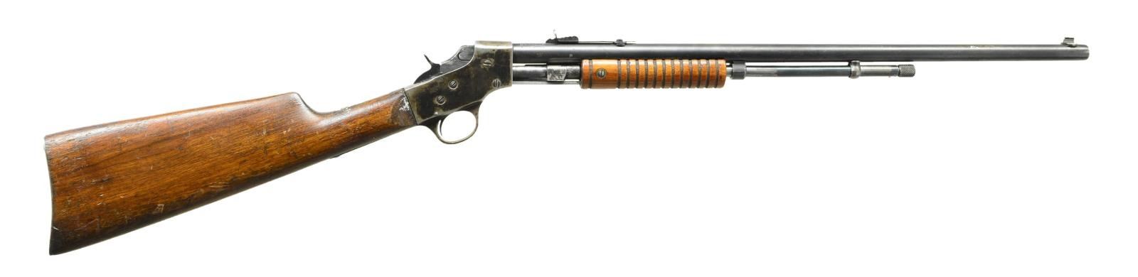 Cal. 22 S, L, & LR. S#564. Bbl. 22". An exposed hammer, pump action, tube feed rimfire rifle. Fixed blade front and elevation adjustable rear ramp sights. Hardwood stock w/ metal buttplate & hardwood forend. Duel extractors on each side of the bolt. The only receiver markings are an "SVG" in a circle on the left side, and the S# on the bottom tang, below the stock. Barrel marked "VISIBLE LOADING REPEATER" on top. CONDITION: Barrel retains a heavy amount of bluing, wearing thin on scattered spots & at muzzle. Receiver and magazine tube retain about 50% finish, with a gentle patina stain visible upon inspection. All markings are clear and crisp. Wood furniture appears to have been refinished and illustrates several impressions. Bright bore w/ strong rifling. Fire control mechanism appears to function correctly when cycled by hand. (22-2785/JZ). CURIO. $125-200