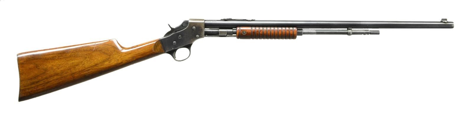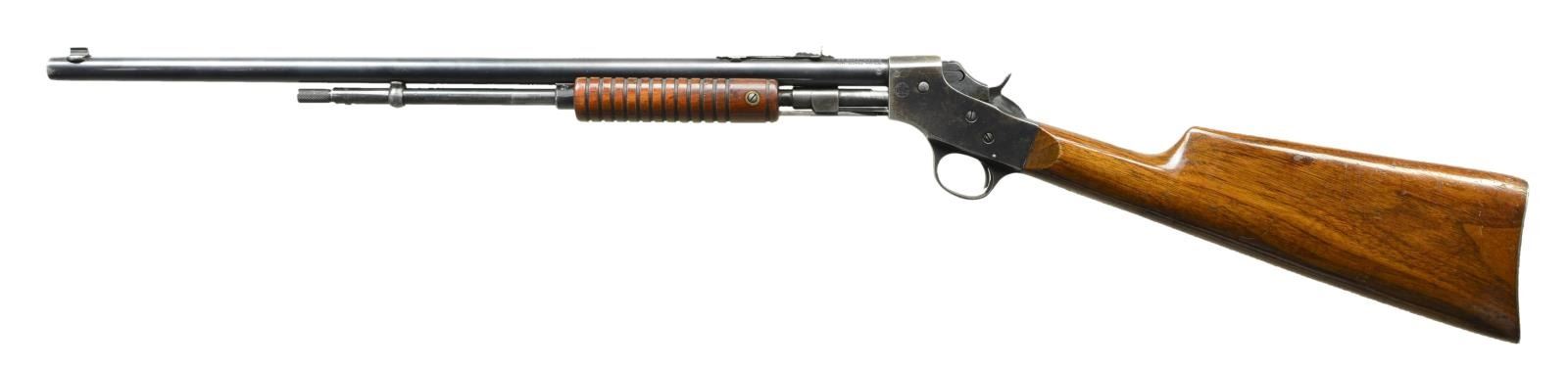 Cal. 22 S, L, & LR. S# 1758. Bbl. 22". An exposed hammer, pump action, tube feed rimfire rifle. Fixed blade front and elevation adjustable rear ramp sights. Hardwood stock w/ metal buttplate & hardwood forend. Duel extractors on each side of the bolt. The only receiver markings are an "SVG" in a circle on the left side, and the S# on the bottom tang, below the stock. Barrel marked "VISIBLE LOADING REPEATER" on top. CONDITION: Barrel retains a heavy amount of bluing, wearing thin on scattered spots & at muzzle. Receiver and magazine tube retain about 80% finish, with a gentle patina stain visible upon inspection. All markings are clear and crisp. Wood furniture illustrates several impressions. Bright bore w/ strong rifling. Fire control mechanism appears to function correctly when cycled by hand. (22-2788/JZ). CURIO. $200-250