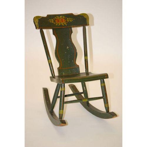 J. SWINT PA PAINTED ROCKING CHAIR - GREEN PAINTED PINE W/ FLORAL PAINTED CREST W/ RED HIGHLIGHTS & PALER GREEN RING CARVINGS & CREST ENDS, VASE BACK ROCKER W/ PLANK SEAT-SIGNED J. SWINT CHAIR MAKER (32" T X 19 1/2" W X 22" D) - IMPERFECTIONS
