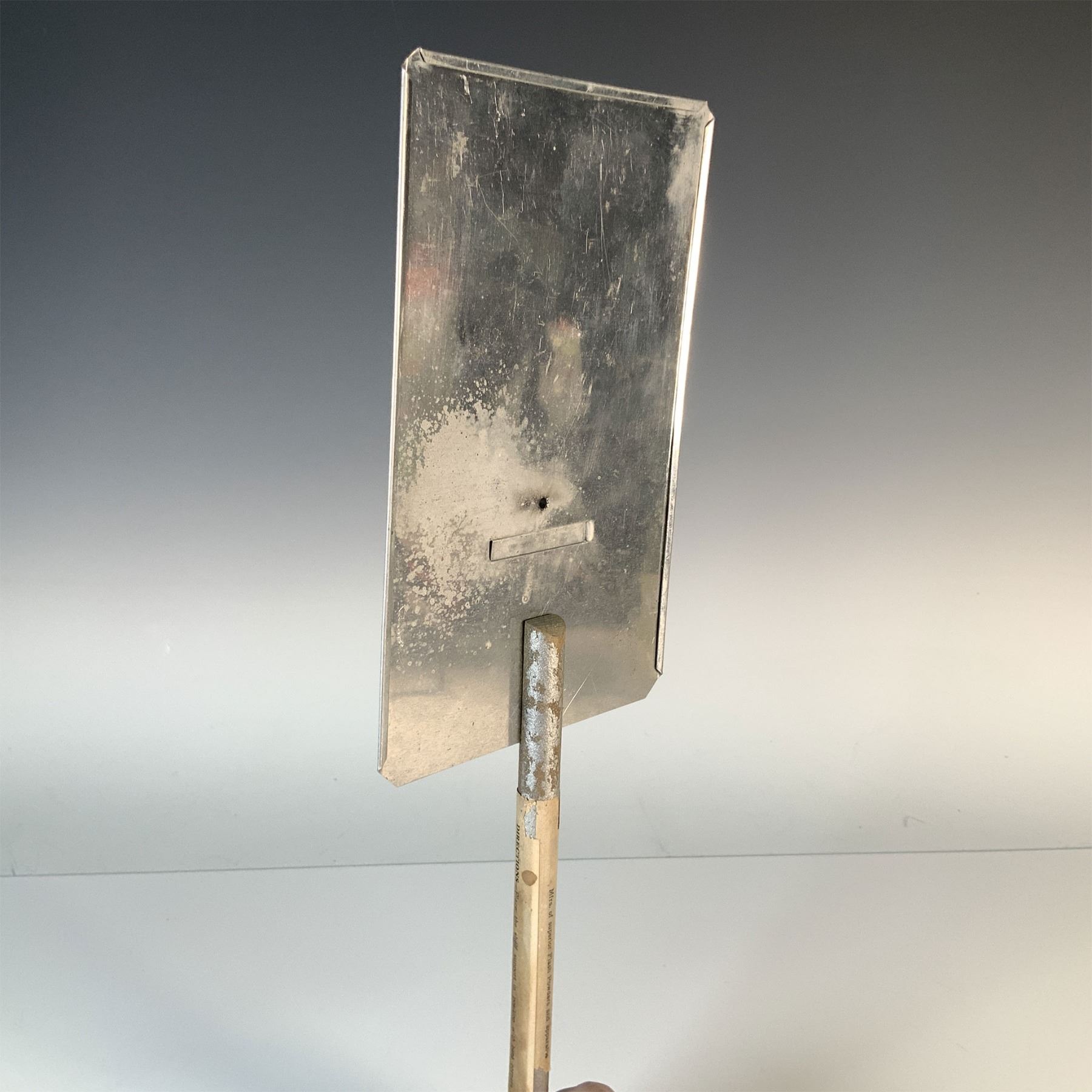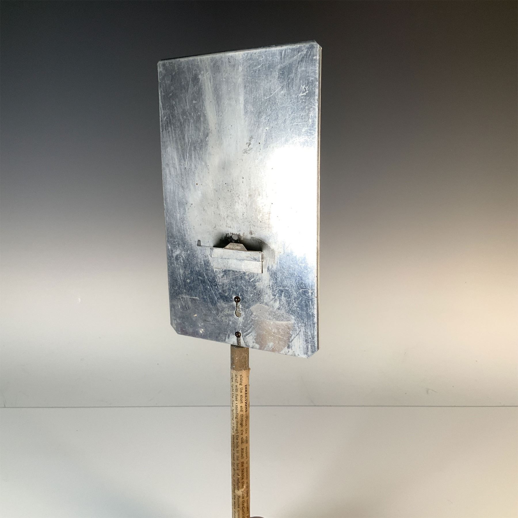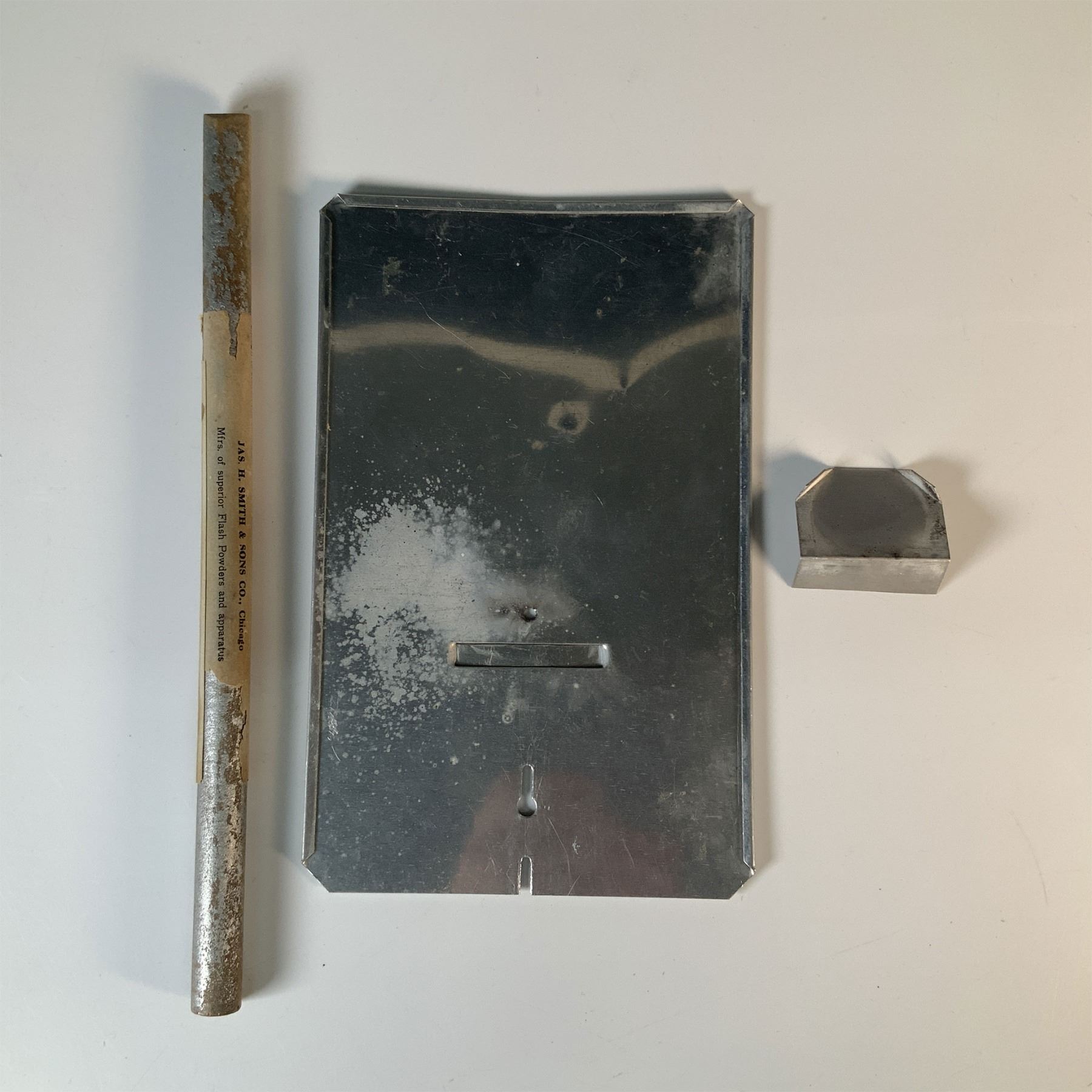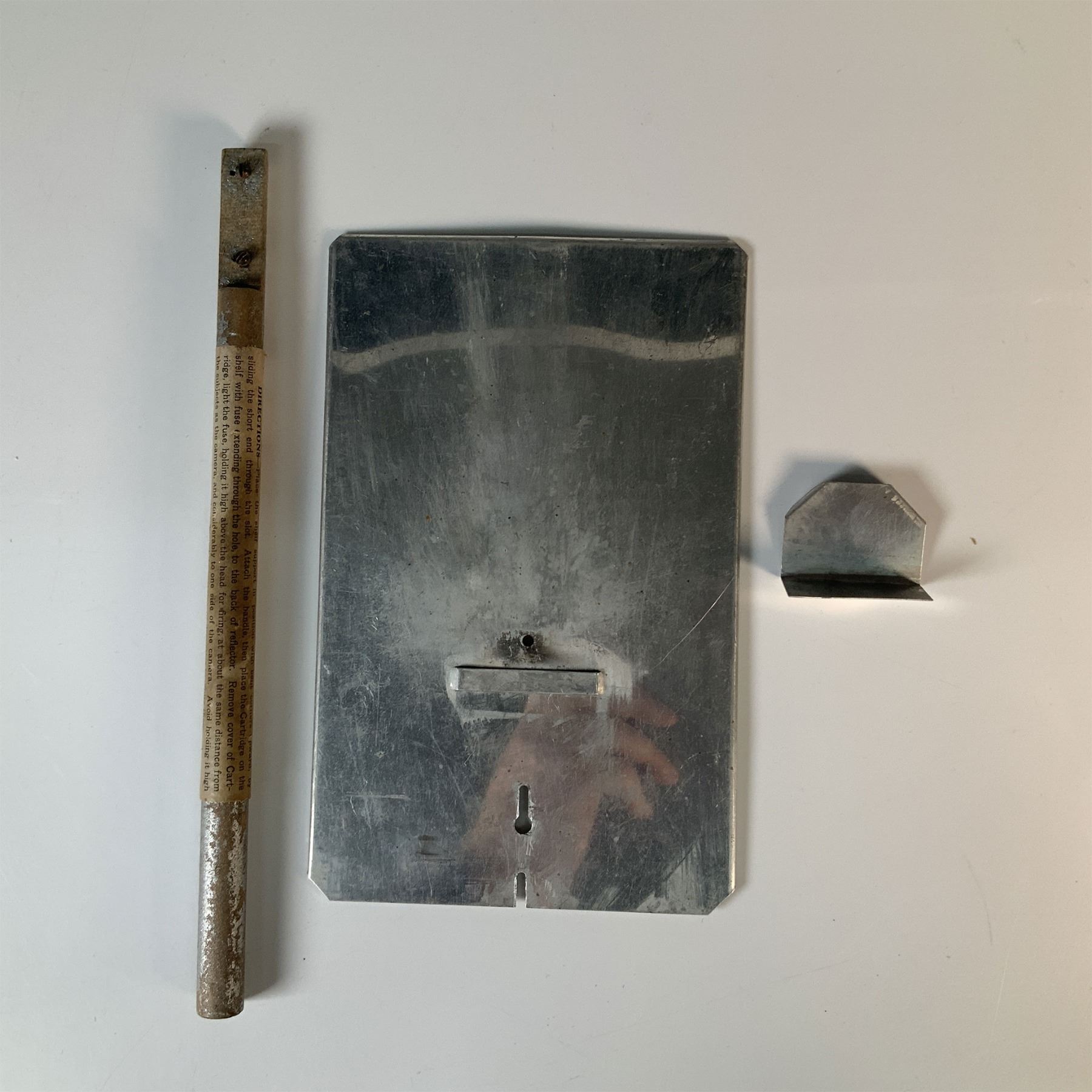 A vintage J. Smith handheld sheet magnesium flash, designed for early photography lighting. This unique piece features a metal plate, a smaller angled support, and a wooden handle with printed instructions for operation. Once used as an essential accessory for capturing well-lit photographs, this flash reflects early 20th-century innovation in photography equipment. A great addition to a photography or vintage technology collection, this piece demonstrates fascinating historical craftsmanship and functionality. Metal Plate: Approximately 8"H; Wooden Handle: Approximately 10"H.
