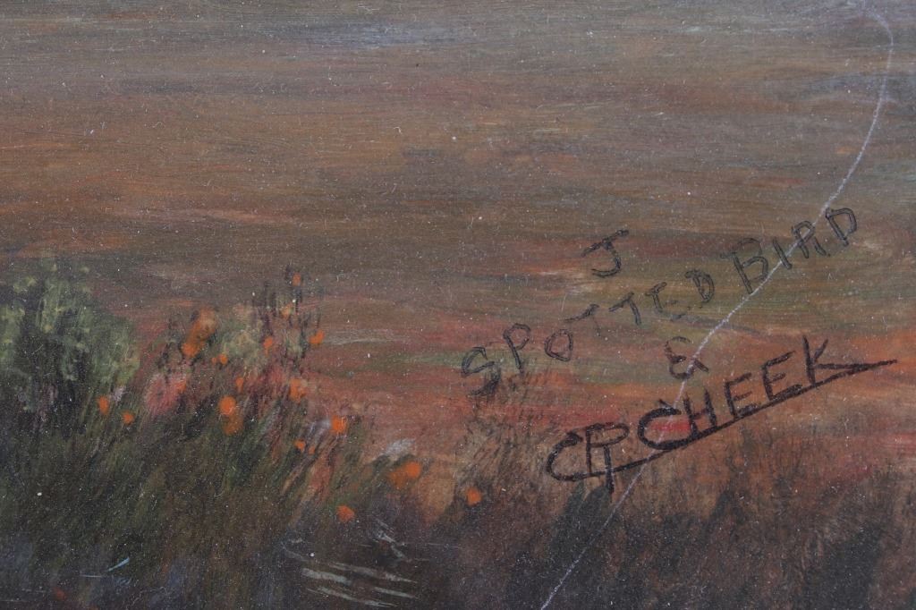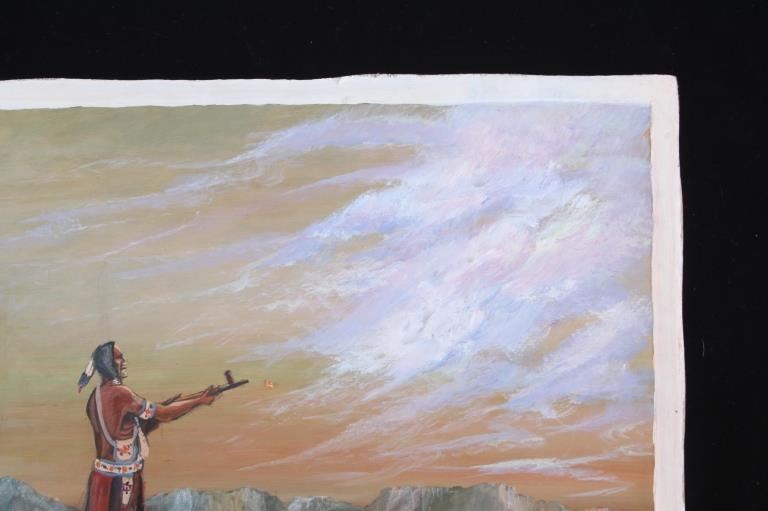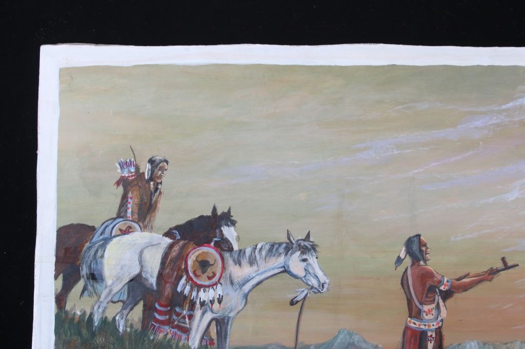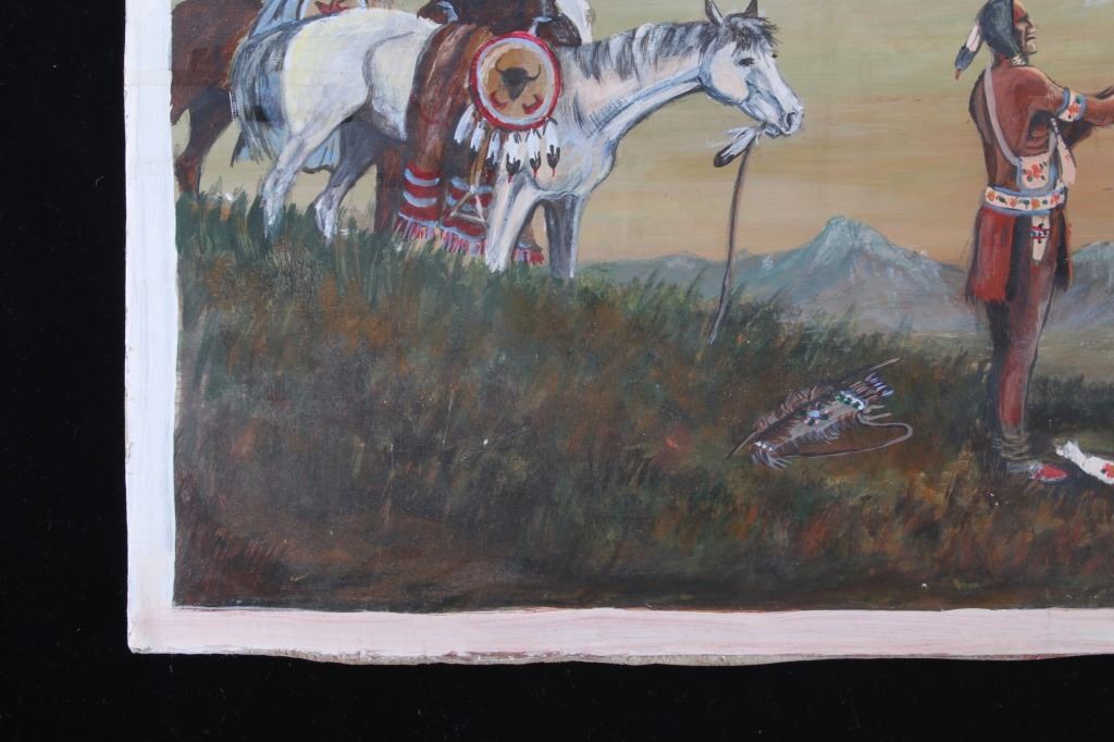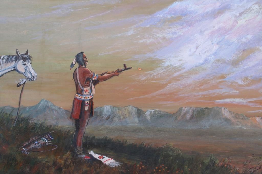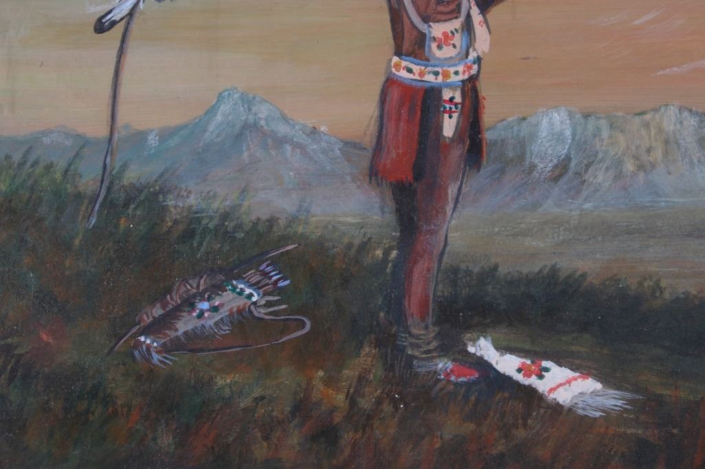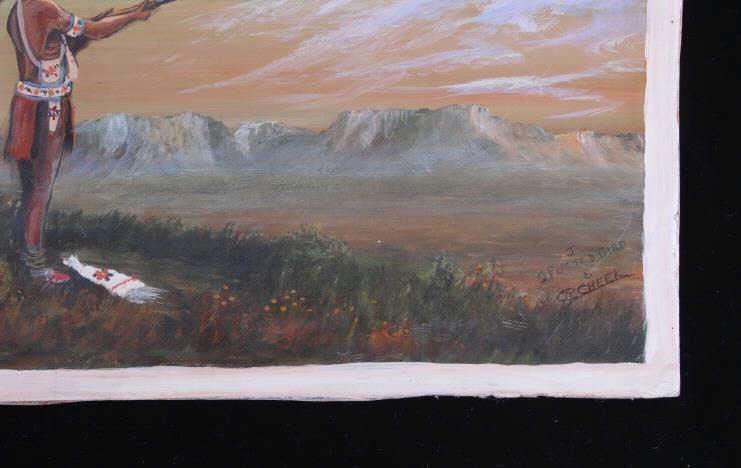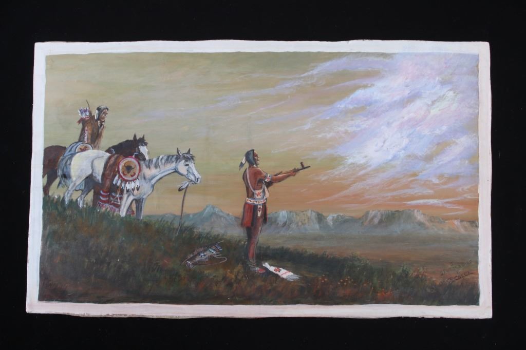 Featured in this lot is this acrylic-on-board by J Spotted Bird & CR Cheek. The painting depicts two native men in ceremonial war paint, offering the peace pipe to the spirit of the sky. There are wonderful colors and tones of a light green, orangish sky with lovely shading to the ground and the pop of the sky spirit that lends to a peaceful exchange. The condition of this painting is good, with some wear to the edges of the border. The measurements of this painting are 14" x 23 1/2".