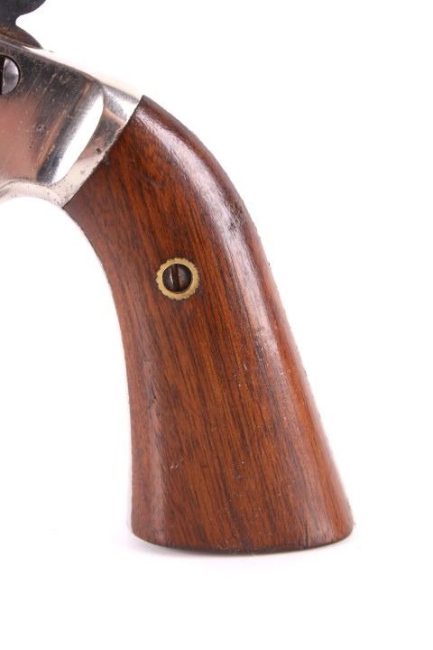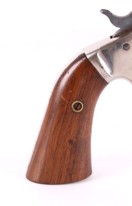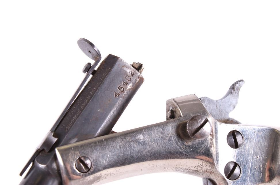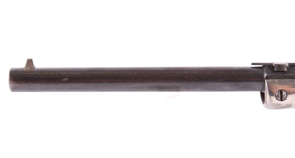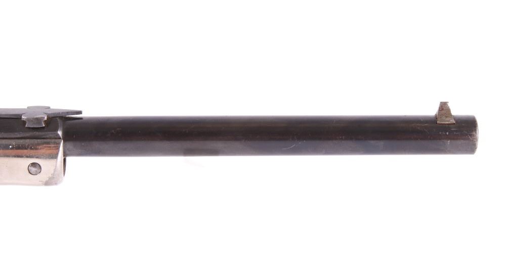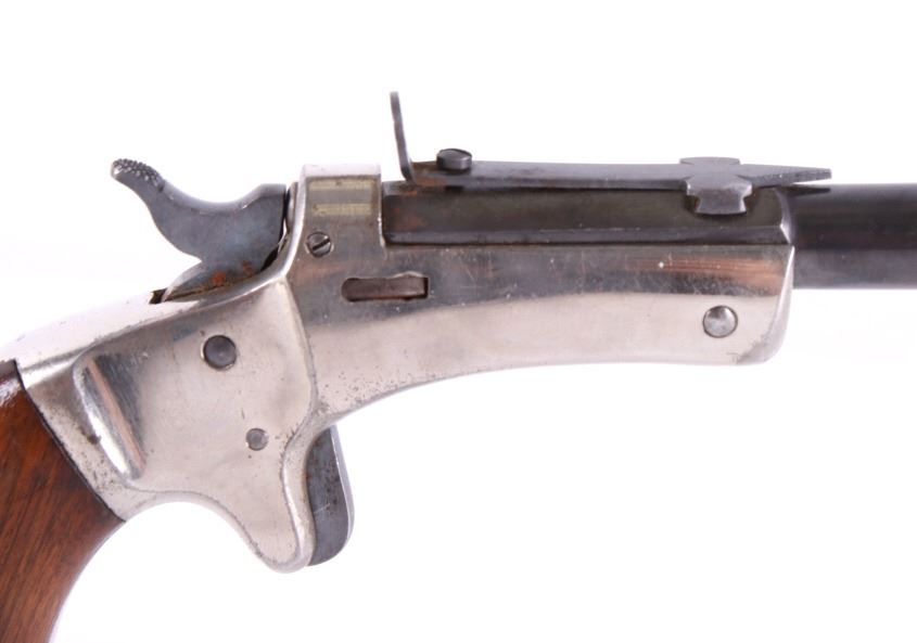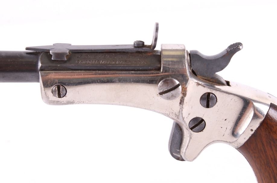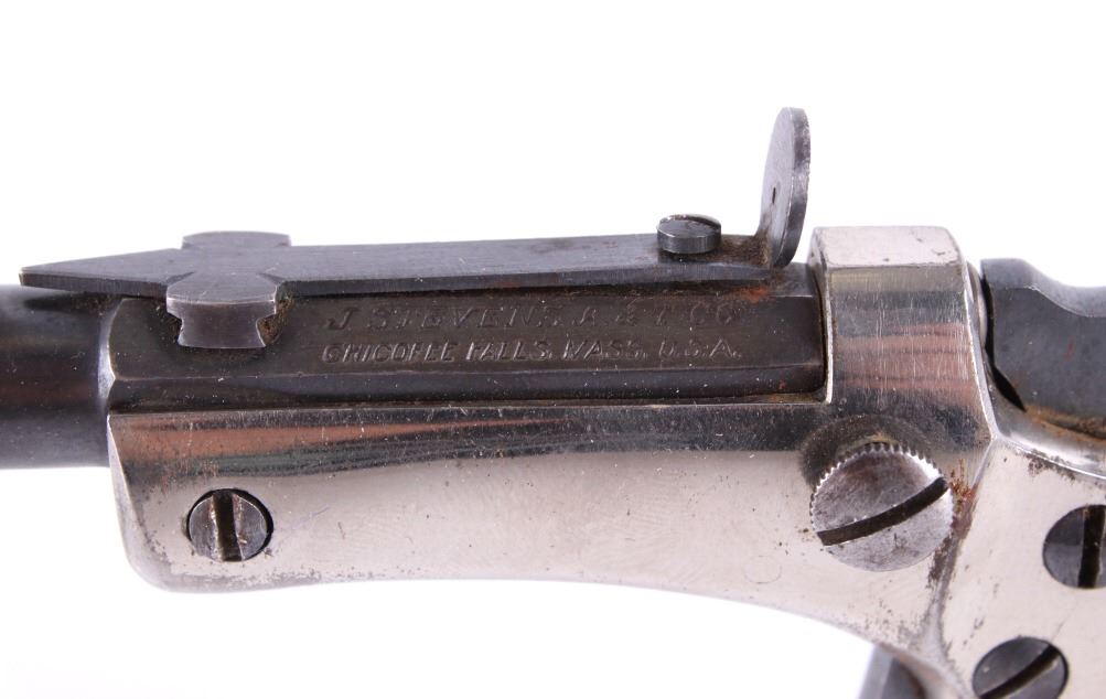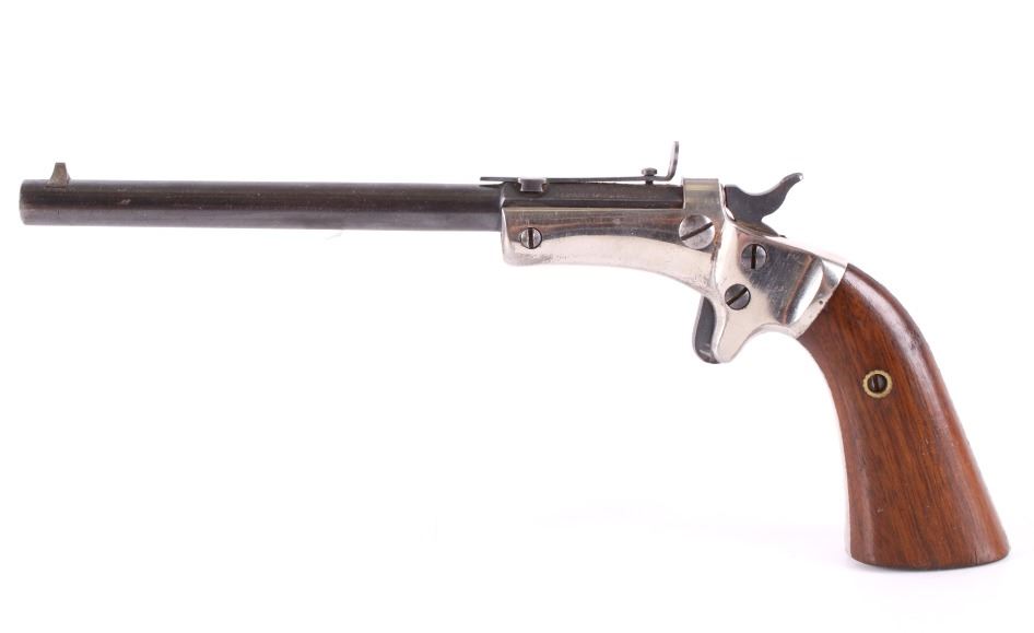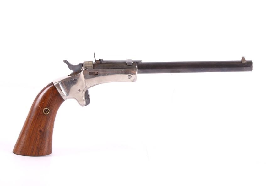 This lot features an original rare Stevens Model No. 43 Diamond .22 single shot competition pistol. The handgun is chambered in a .22 Rimfire caliber and shows a steel frame with longer grip having smooth walnut factory original inserts. The piece shows a round 6-inch (4.5” round and 1.5” octagonal) barrel with dovetail mounted bead front sights and standard adjustable notched rear sights. This is an all serial number matching firearm. The pistol shows a nickel-plated steel frame retaining some of the original finish and the barrel retaining the original blue showing. This pistol shows good condition with minor handling wear and signs of use. Serial Number: 45402. This firearm qualifies as a Curio & Relic, and requires FFL Transfer or NICS Background Check. Matt