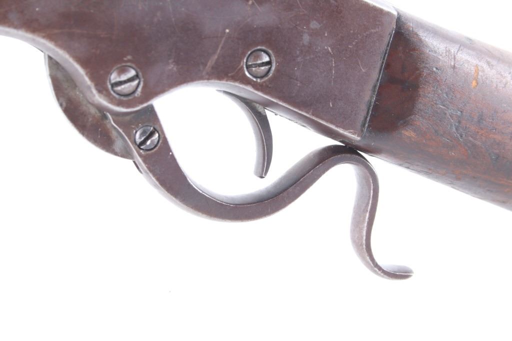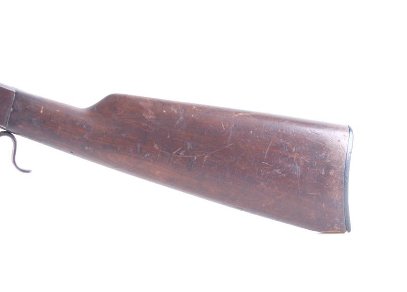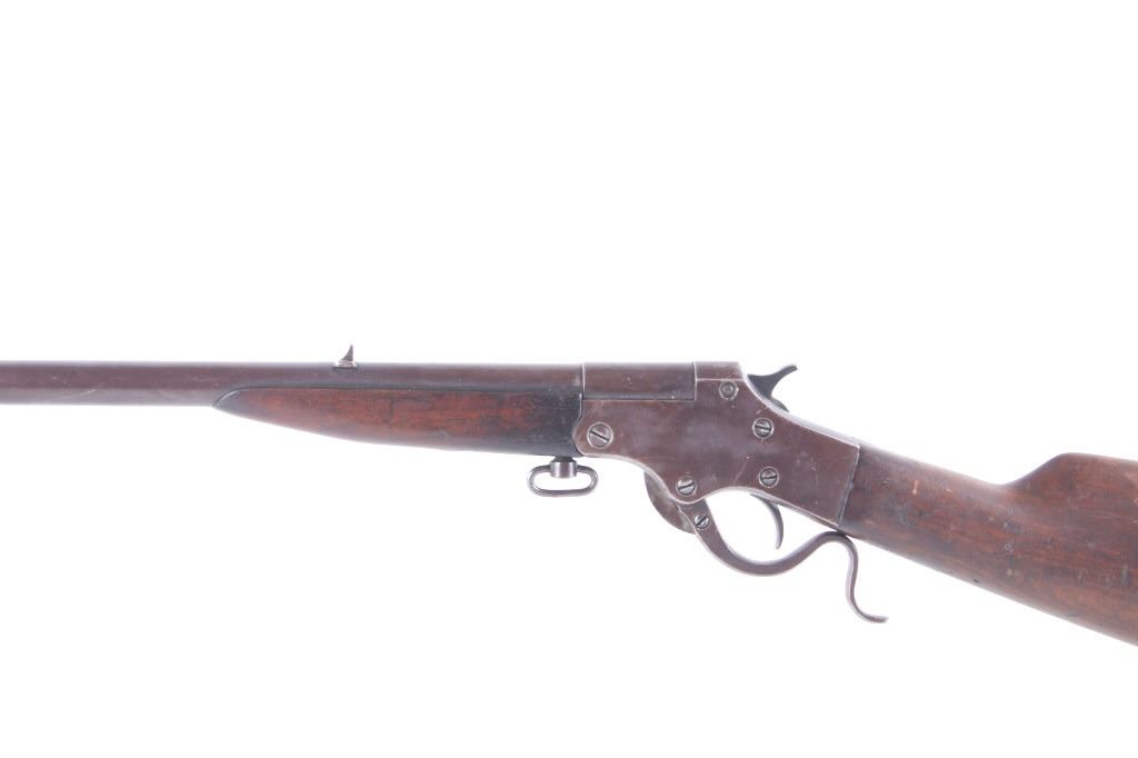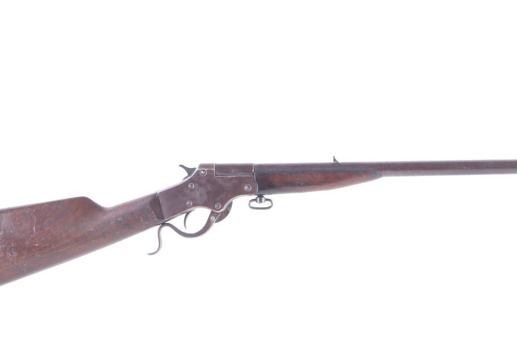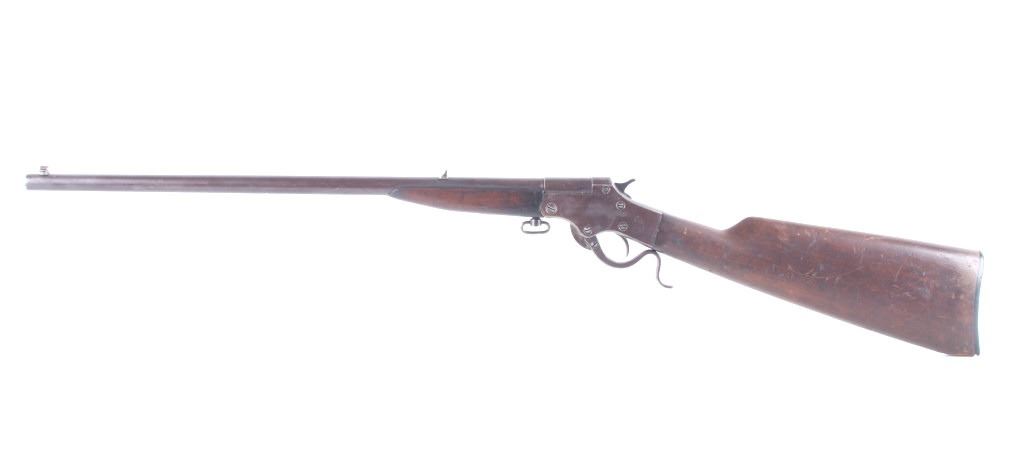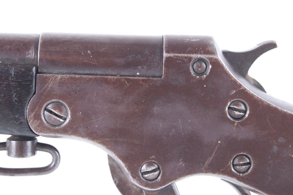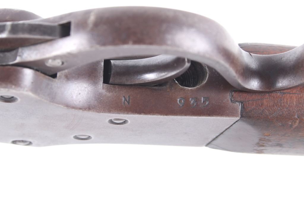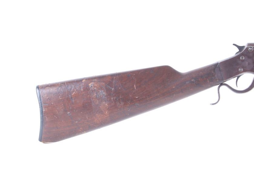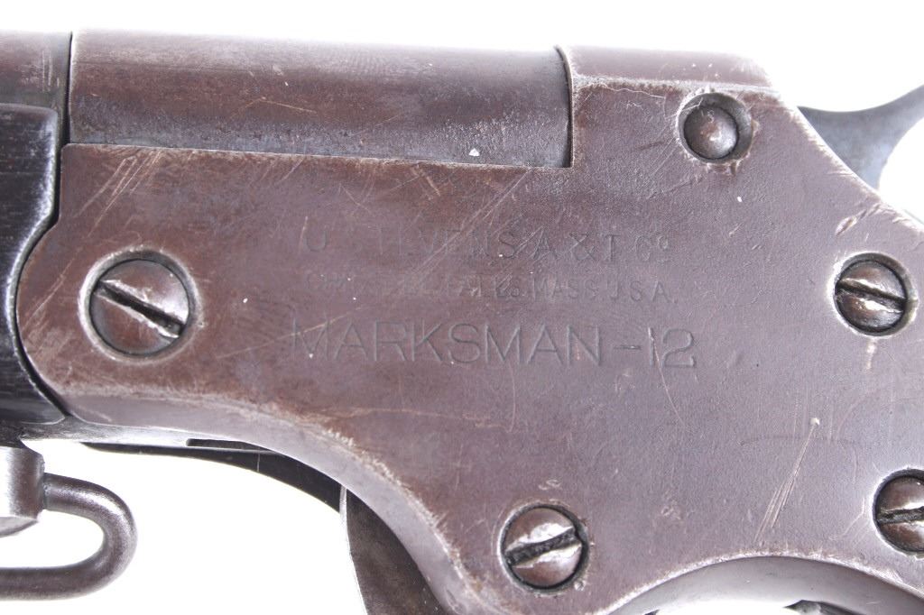 Featured in this lot we have a J. Stevens Marksman - 12 tip-up rifle chambered in .32 long caliber. The rifle was manufactured in the early 1900's by J. Stevens Arms & Tools Company. The rifle displays a 20" long round barrel, walnut stock and frontgrip, fixed sights, tip up lever action, and single action hammer. The left side of the frame is marked "J. STEVENS A & T CO CHICOPEE FALLS, MASS. U.S.A. MARKSMAN - 12" with the top of the barrel marked ""32 - LONG". Mechanically the rifle shows good condition with a crisp trigger, smooth lever tip up action, and overall working condition. The rifle shows good condition overall with a warm patina across the exterior and shows wear due to age and use with a small part of the stock missing on the bottom. The rifle weighs 3lbs 14oz. Serial Number: N935. This firearm qualifies as a Curio & Relic firearm, and requires FFL Transfer or NICS Background Check.