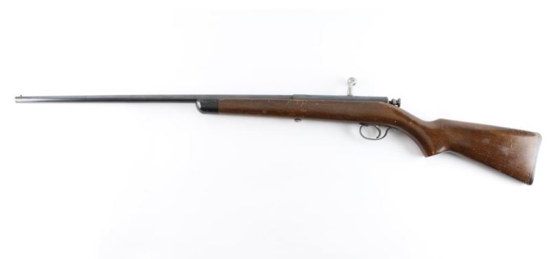 American made bolt action .410 shotgun made between 1933 and 1942. It accepts 2.5" and 3" shells as stamped on barrel. It features a 24" blued barrel with a brass bead front sight, smooth trigger, metal trigger guard and hard plastic buttplate. Lop is 13.25". Bore looks good. Metal finish looks good with light surface rust on bottom of barrel from forend to muzzle. Wood stock is fine but used and shows it. Condition is NRA Good **C&R Firearm**