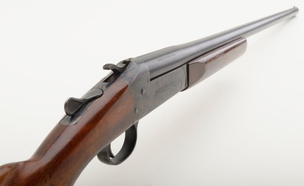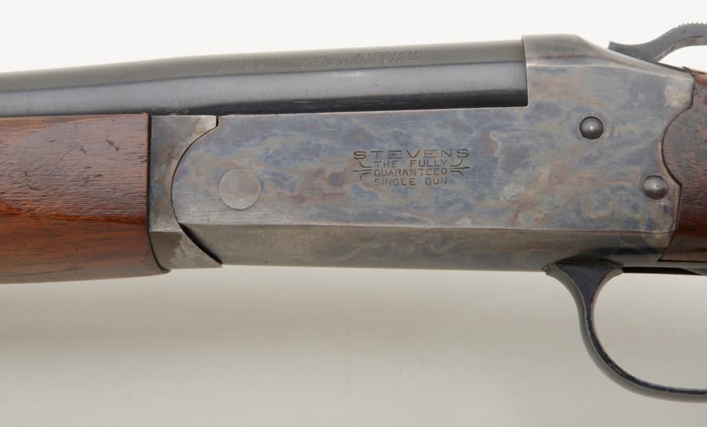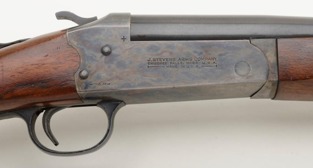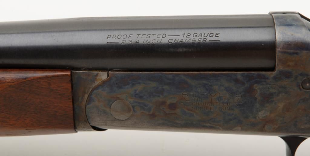 J. Stevens top break single shot shotgun, 12 gauge, 32” barrel, blue and case hardened finish, wood stocks, #17GX in overall fine condition showing the majority of its original finish, fine bore, action, markings and stocks with a couple mars from storage. (Modern). Est.: $250-$500.