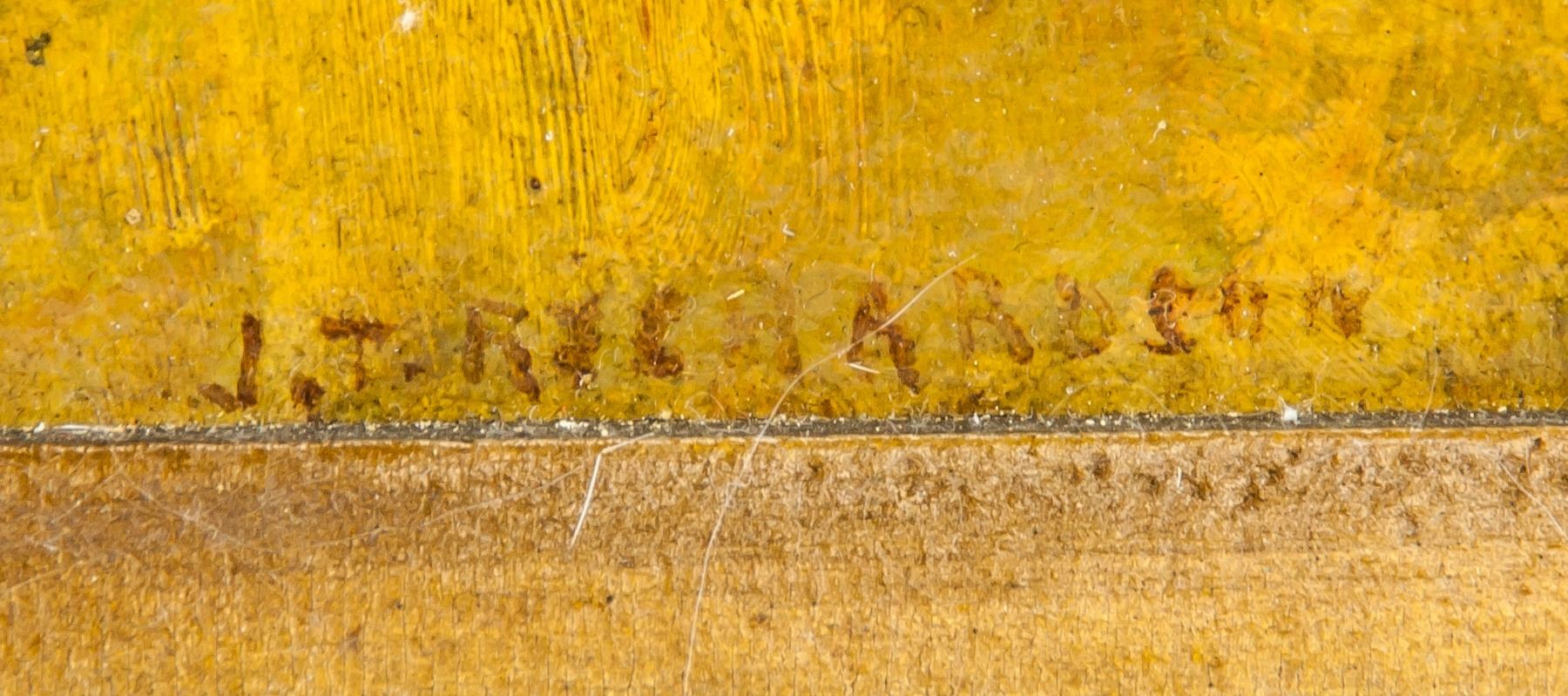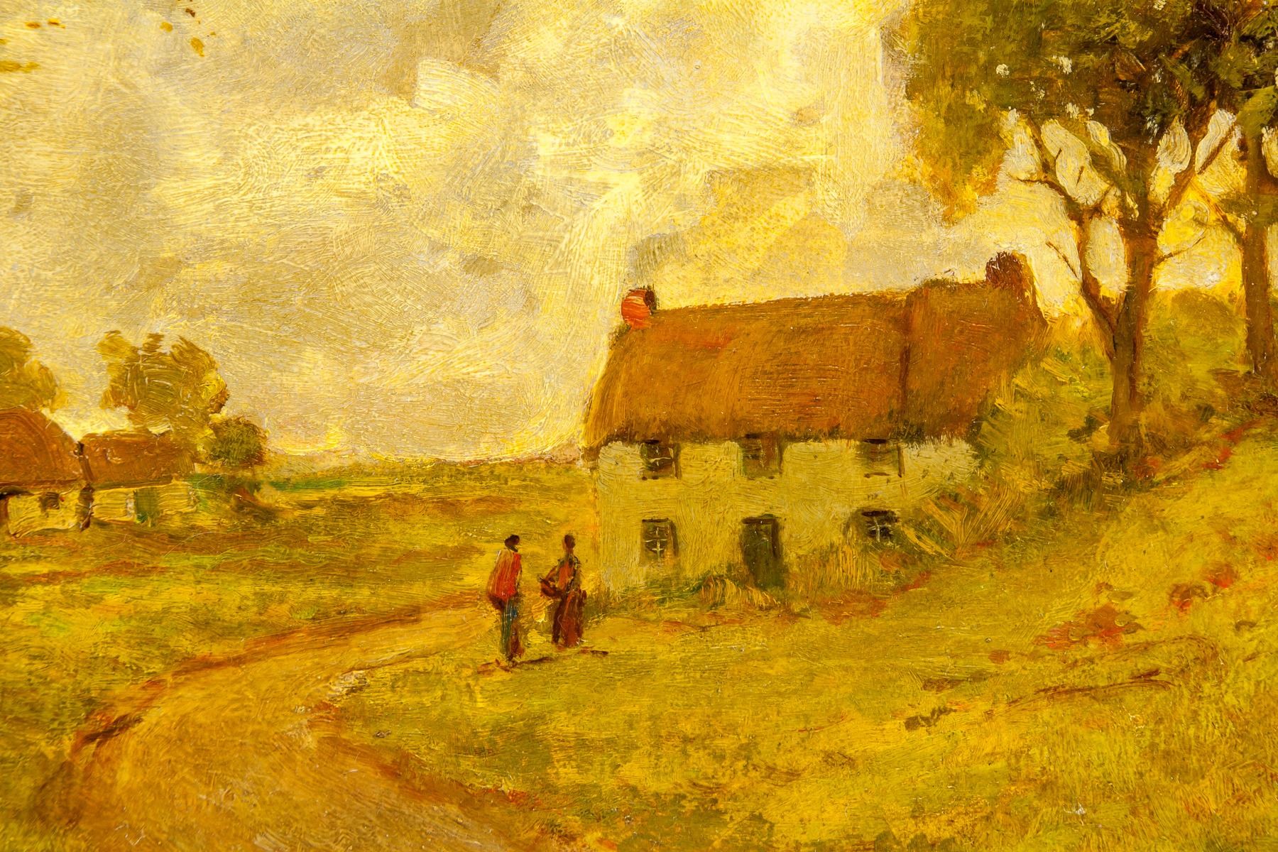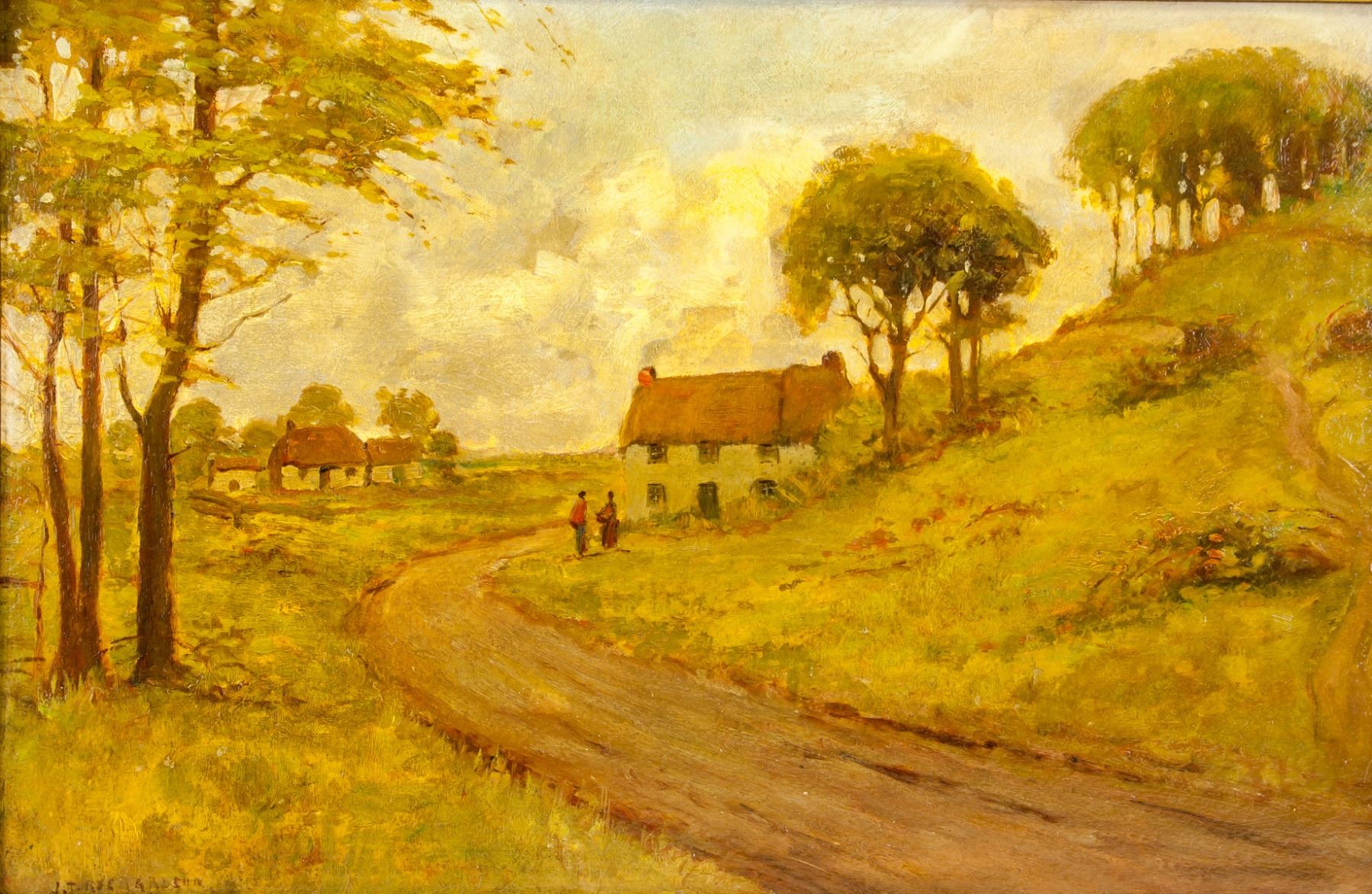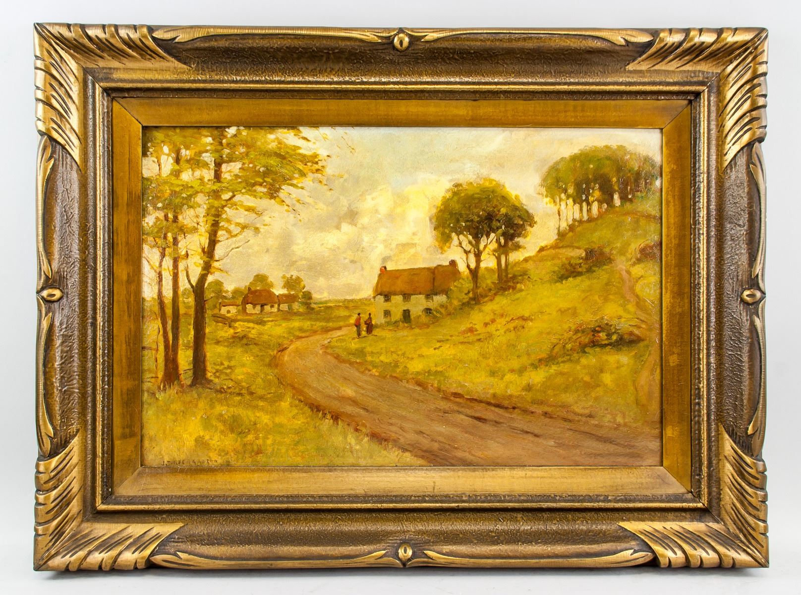 Oil on canvas, framed. Featuring landscape country lane scene. Signed and attr. J. T. (John Thomas) Richardson (British, 1860-1942) on the lower right corner. 33.5 x 51 cm (13.2 x 20.1 inches). Richardson was born in Falmouth, the son of a sea captain and channel pilot. He studied at South Kensington School of Art and Etaples, and exhibited at the Royal Academy. In 1901 he married Judith Miles in Penzance and the couple lived at 14 Chard Terrace, Falmouth as well as in France and Canada (where he spent the last ten years of his life). He died in Regina, Saskatchewan, Canada. He is a much under-rated British Impressionist, although his work is represented in public galleries in the UK and abroad.