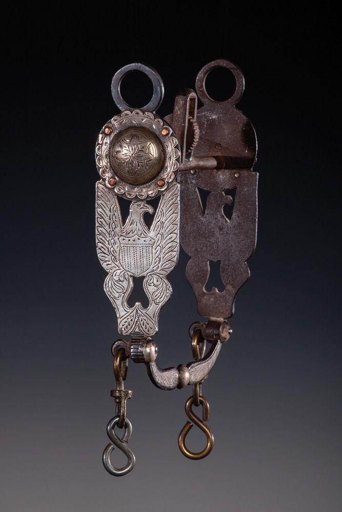 J. Tapia unmarked Eagle Half-Breed Bit. Silver overlaid Southern California (Los Angeles) unmarked J. Tapia high and narrow half-breed eagle bit with inlaid slobber bar, 2" domed scalloped conchos on the cheeks, and Jesus's distinctive trademark engraving. Fine condition, circa 1910.
