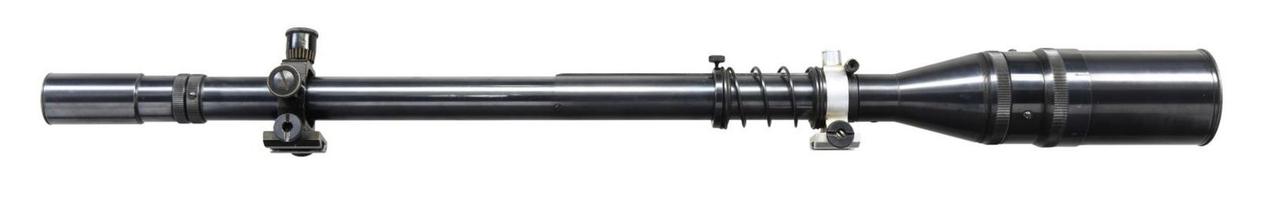 SCOPE. S# 30939. Overall: 25 3/4". Tube diameter: 1". Fine crosshairs with center dot & unusual 2 dot range finding set up along vertical crosshair. Comes with lens caps, recoil spring. in the white Unertl base & black anodized Unertl micrometer base. CONDITION: very good blue showing light handling marks, occasional pinprick oxidation & light scratches. Clear & serviceable optics. (02-22042/MD). $400-700.