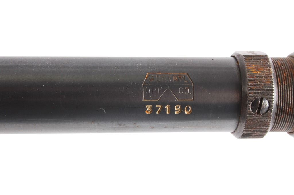 This is a J. Unertl target rifle scope. The scope features a 16X power with an adjustable objective lens and has the original Unertl externally adjustbale mounts. The scope is marked near the ocular lens "J. Unertl Opt. Co.". Also included are the original lens caps. The target rifle scope is in good condition with clear optics and only minor wear. The scope measures 25.5" long.