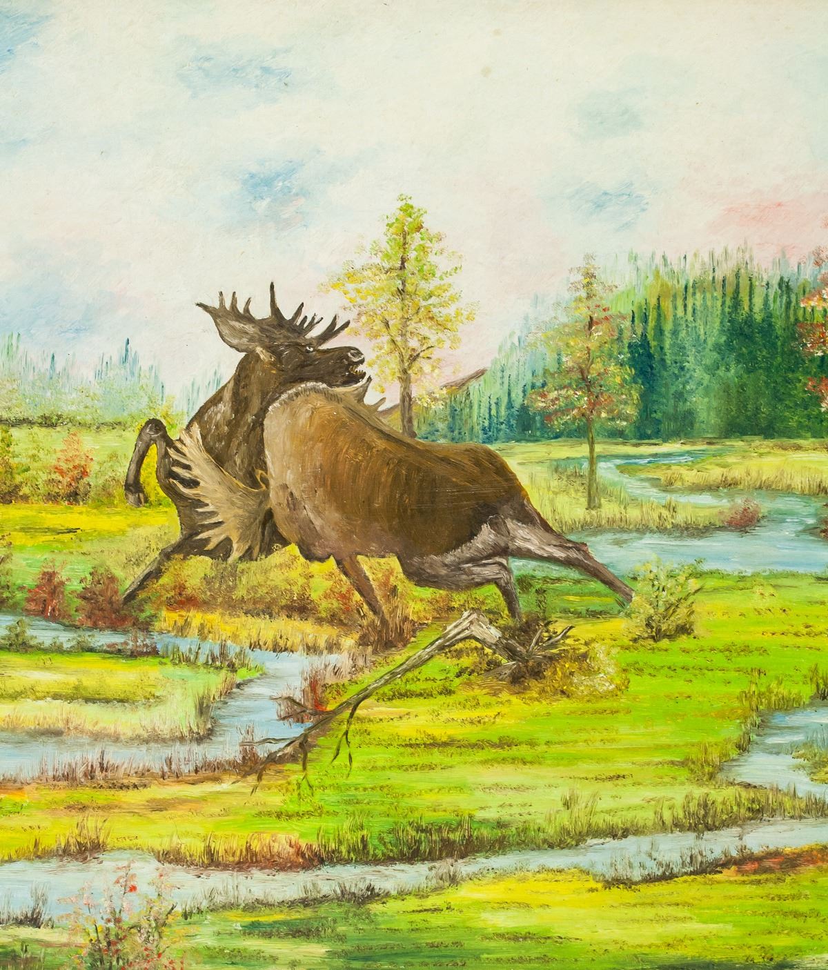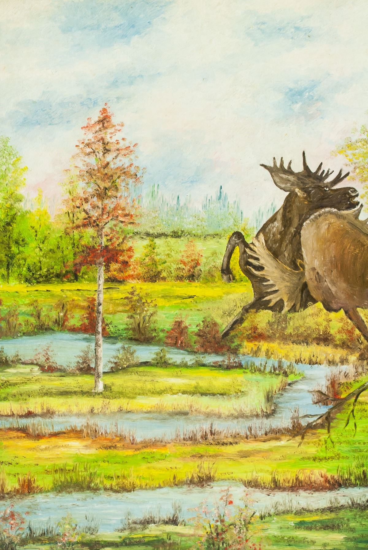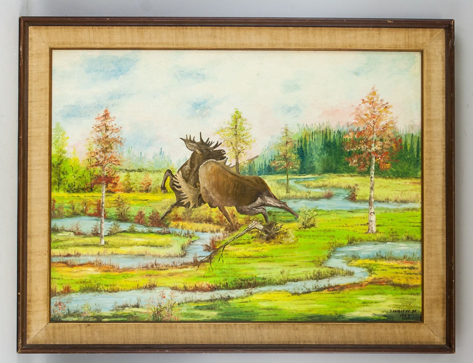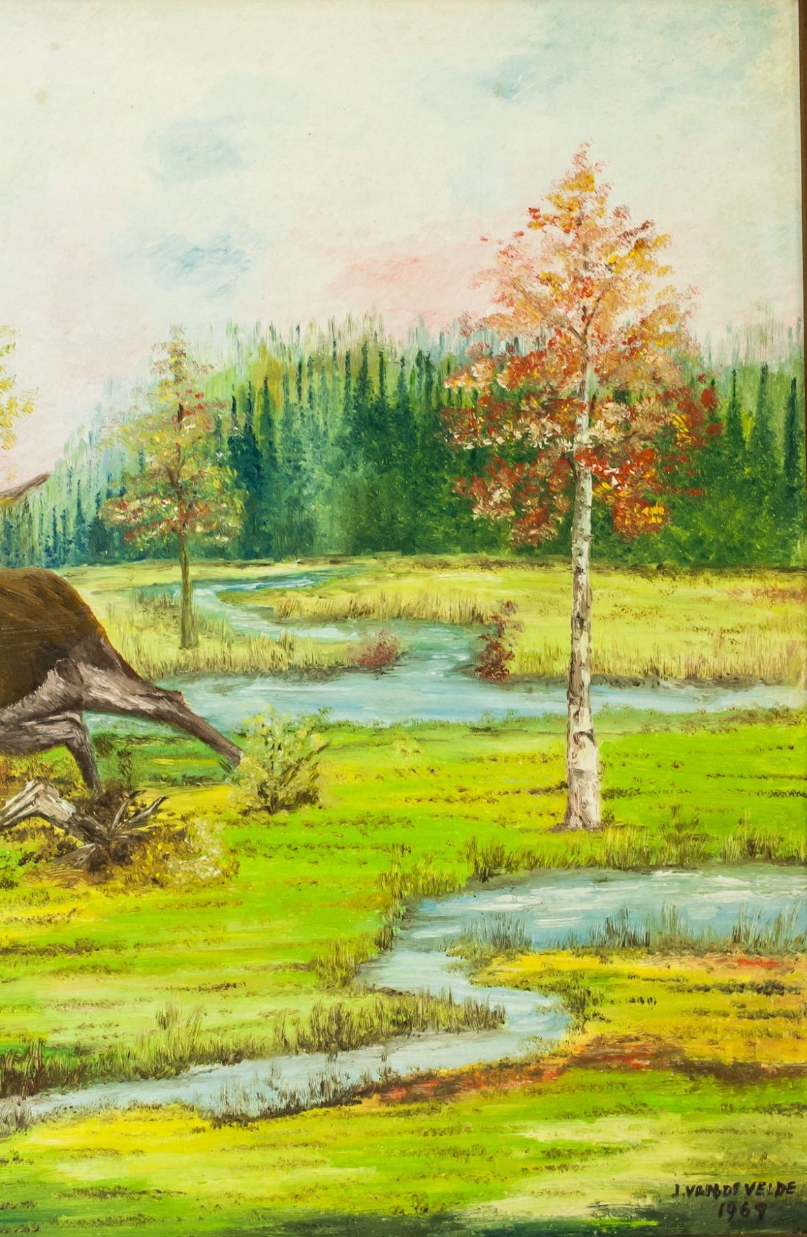 Oil on board, framed. Featuring a landscape scene with a moose. Signed by the artist "J. Vandevelde", dated 1969 on the lower right corner. Artwork information on verso, entitled "Moose". 56 x 73 cm (22 x 29 inches)