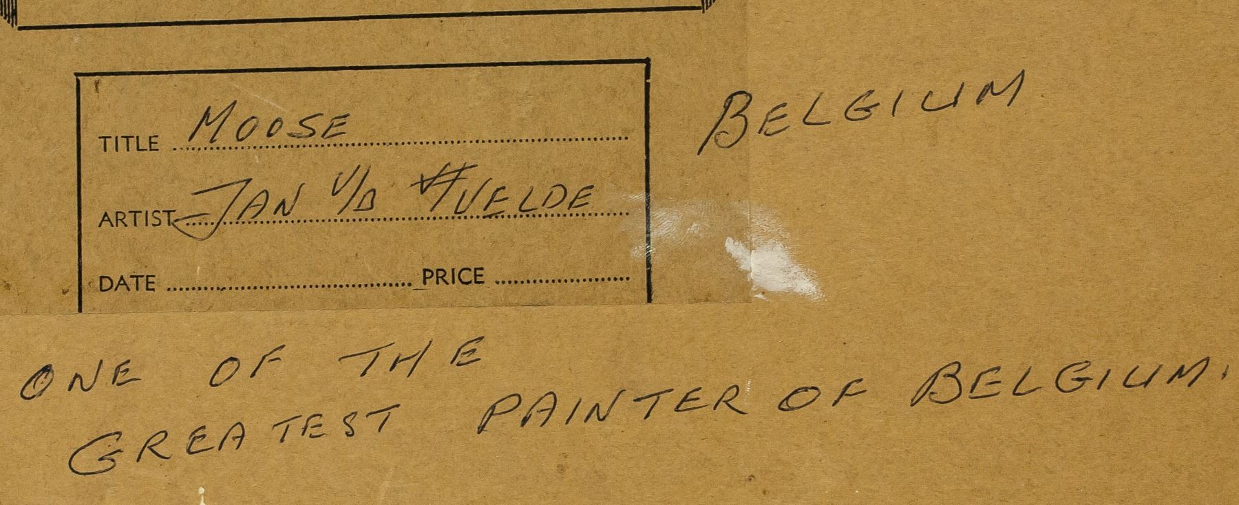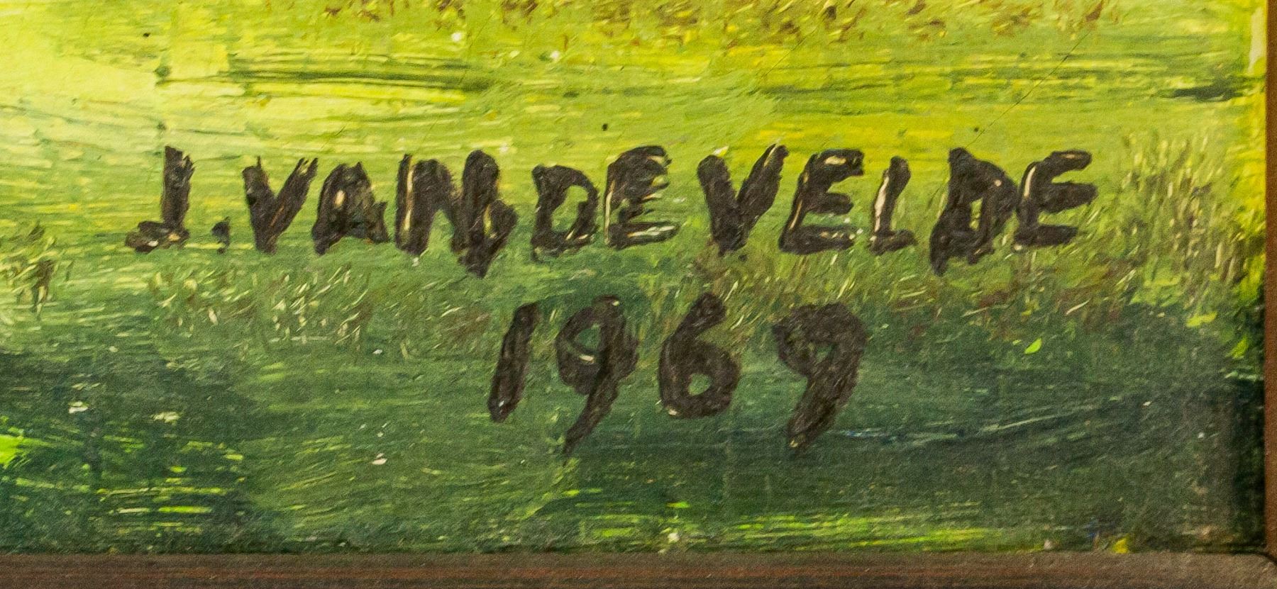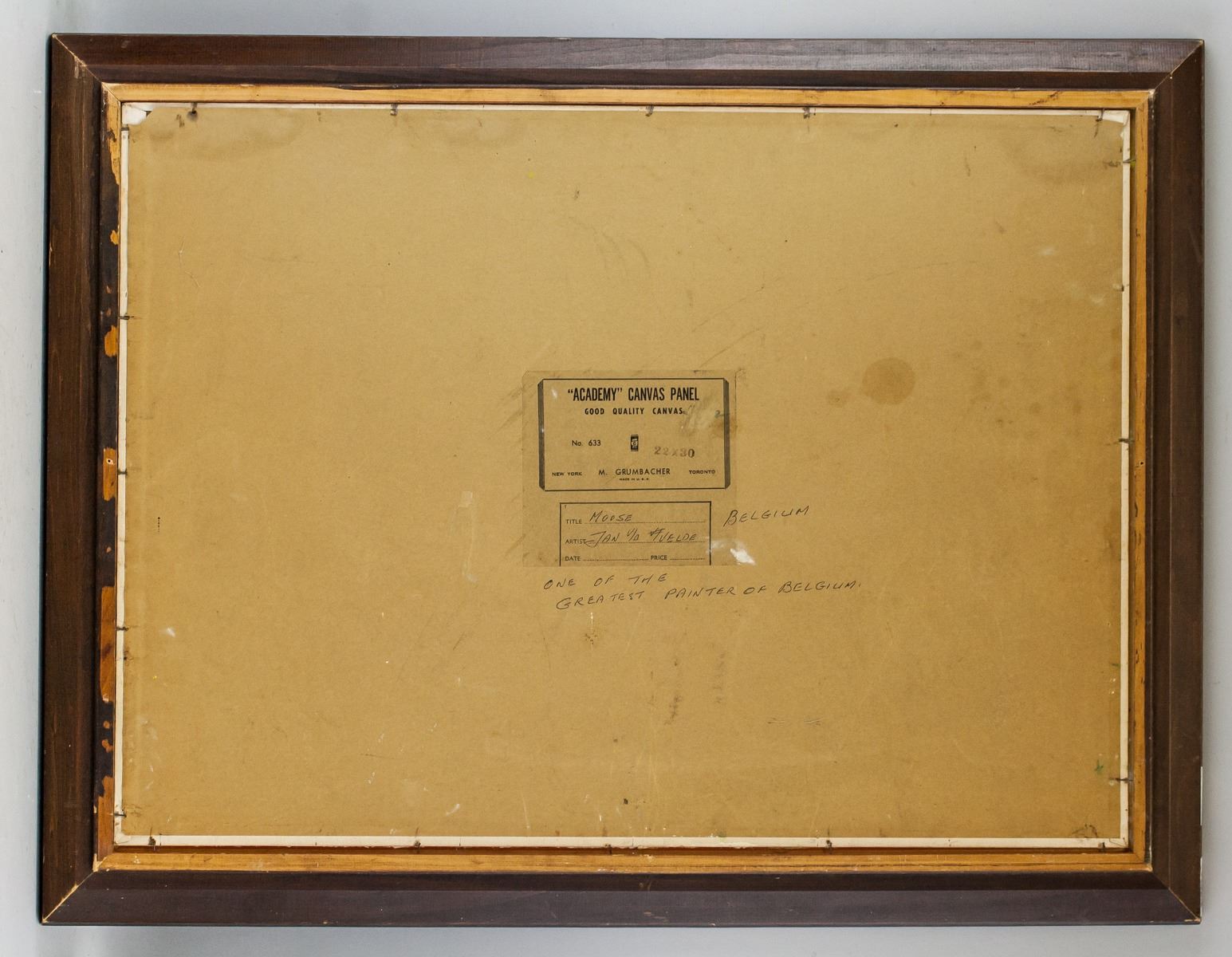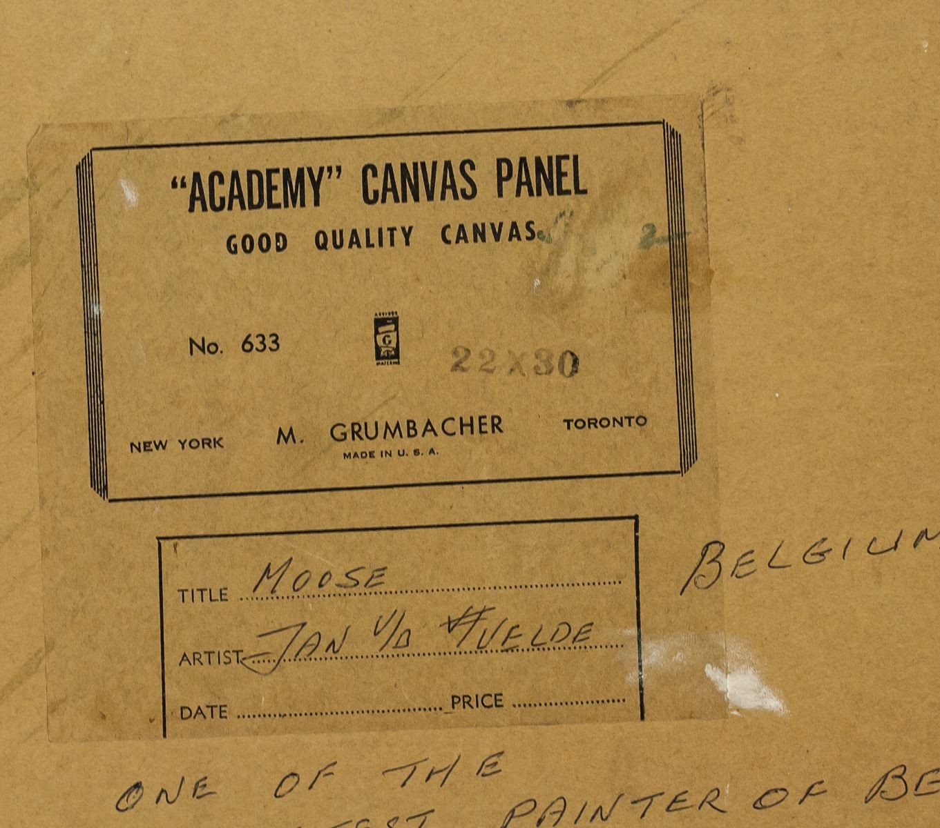Oil on board, framed. Featuring a landscape scene with a moose. Signed by the artist "J. Vandevelde", dated 1969 on the lower right corner. Artwork information on verso, entitled "Moose". 56 x 73 cm (22 x 29 inches)