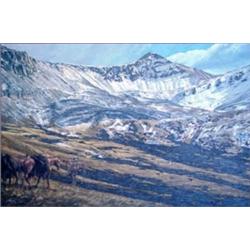 J. Velazquez. Large Oil on Canvas. Man & Teepee in Mountain Landscape. 40" x 59.5". Framed. Estimate $2,500 - $3,000.