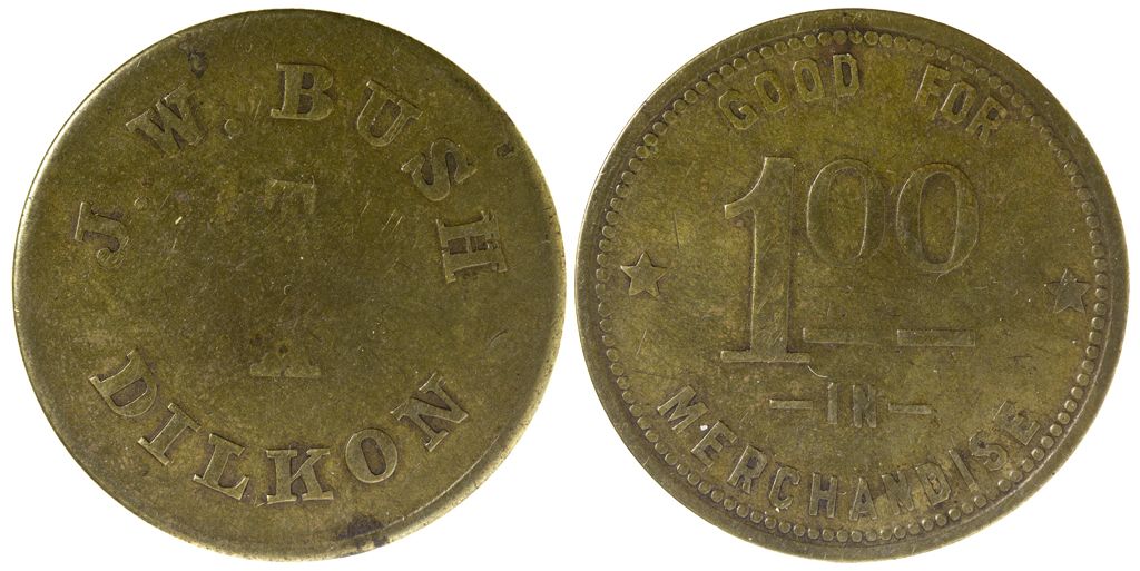 Obverse: J.W. Bush / T / A / Dilkon; Reverse: Good for / 1.00 / In / Merchandise. BR, 35mm, R7, very good condition with some wear on the obverse.City: DilkonCounty: Navajo State: AZDate: