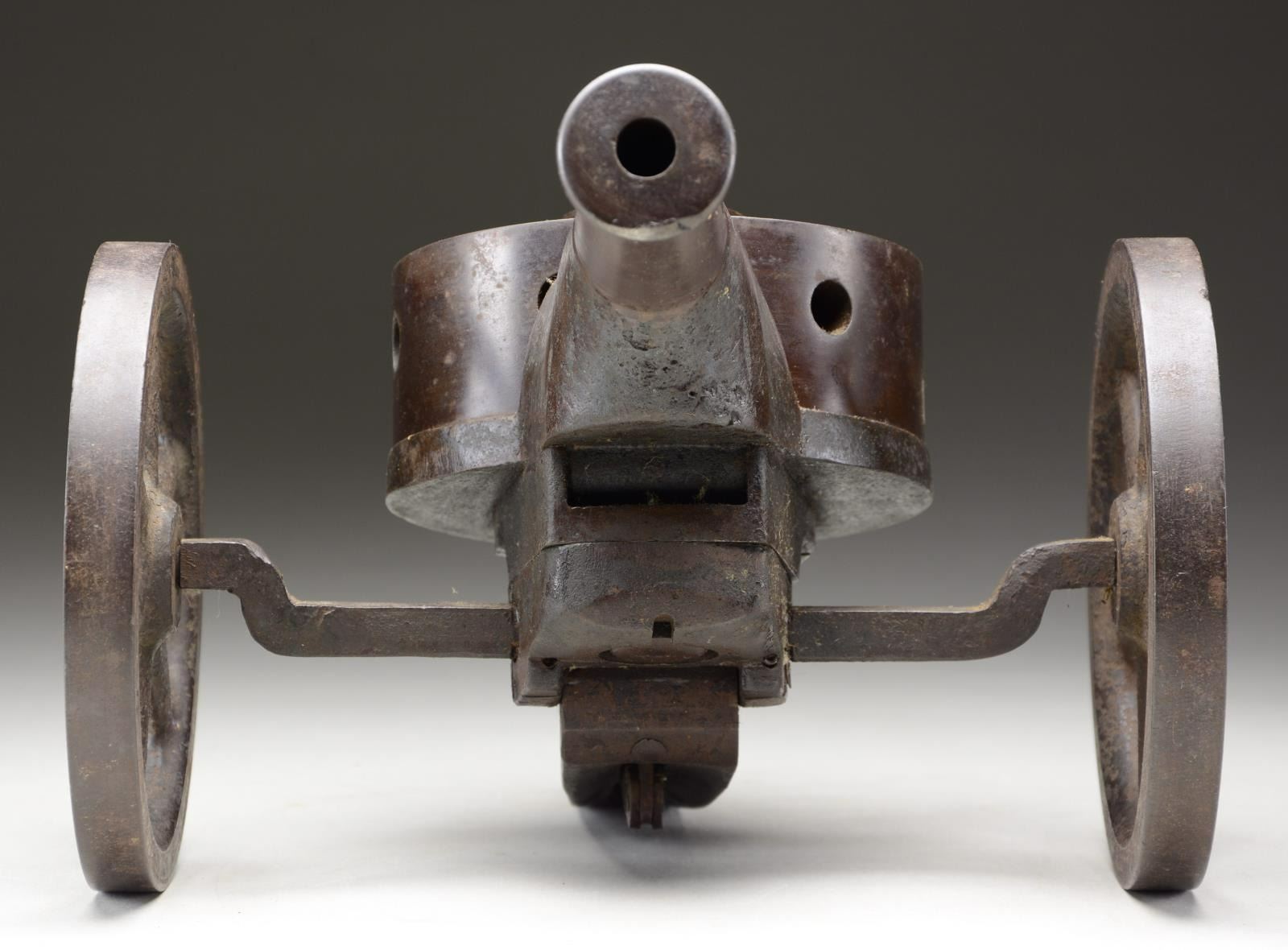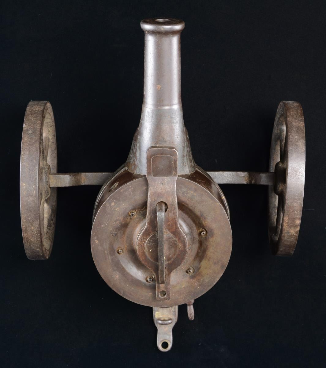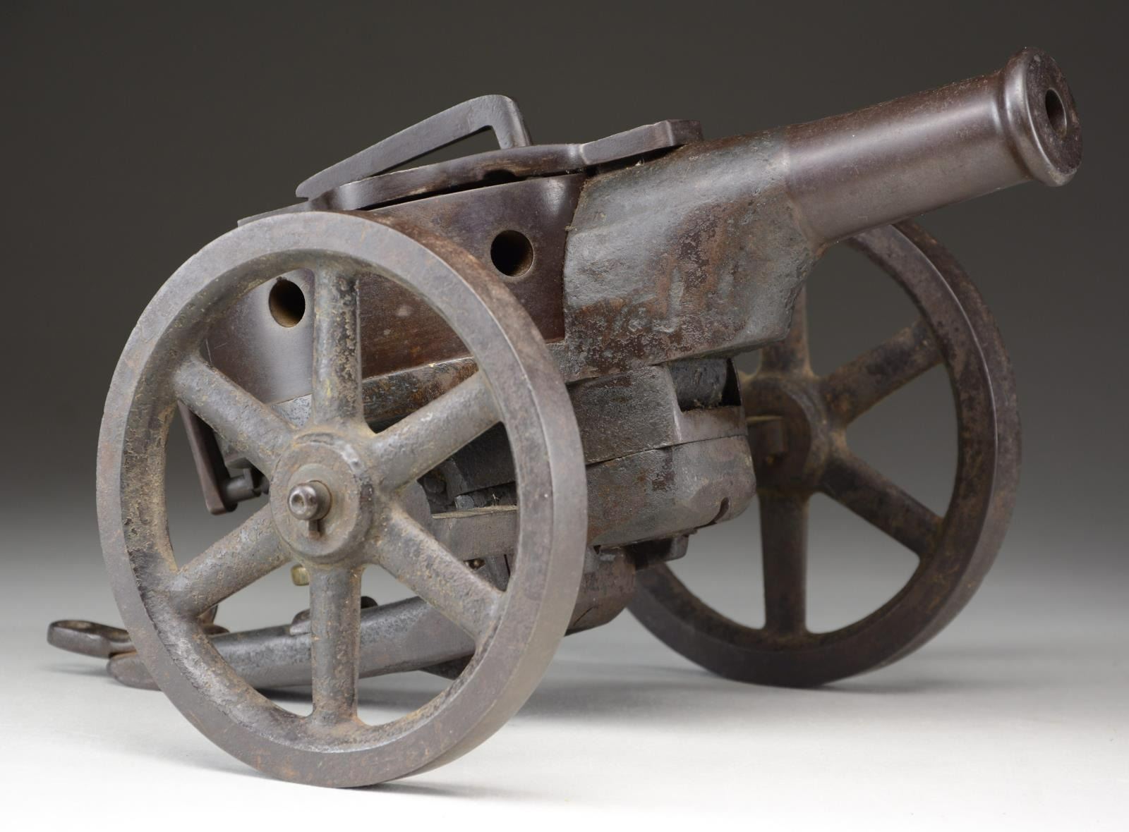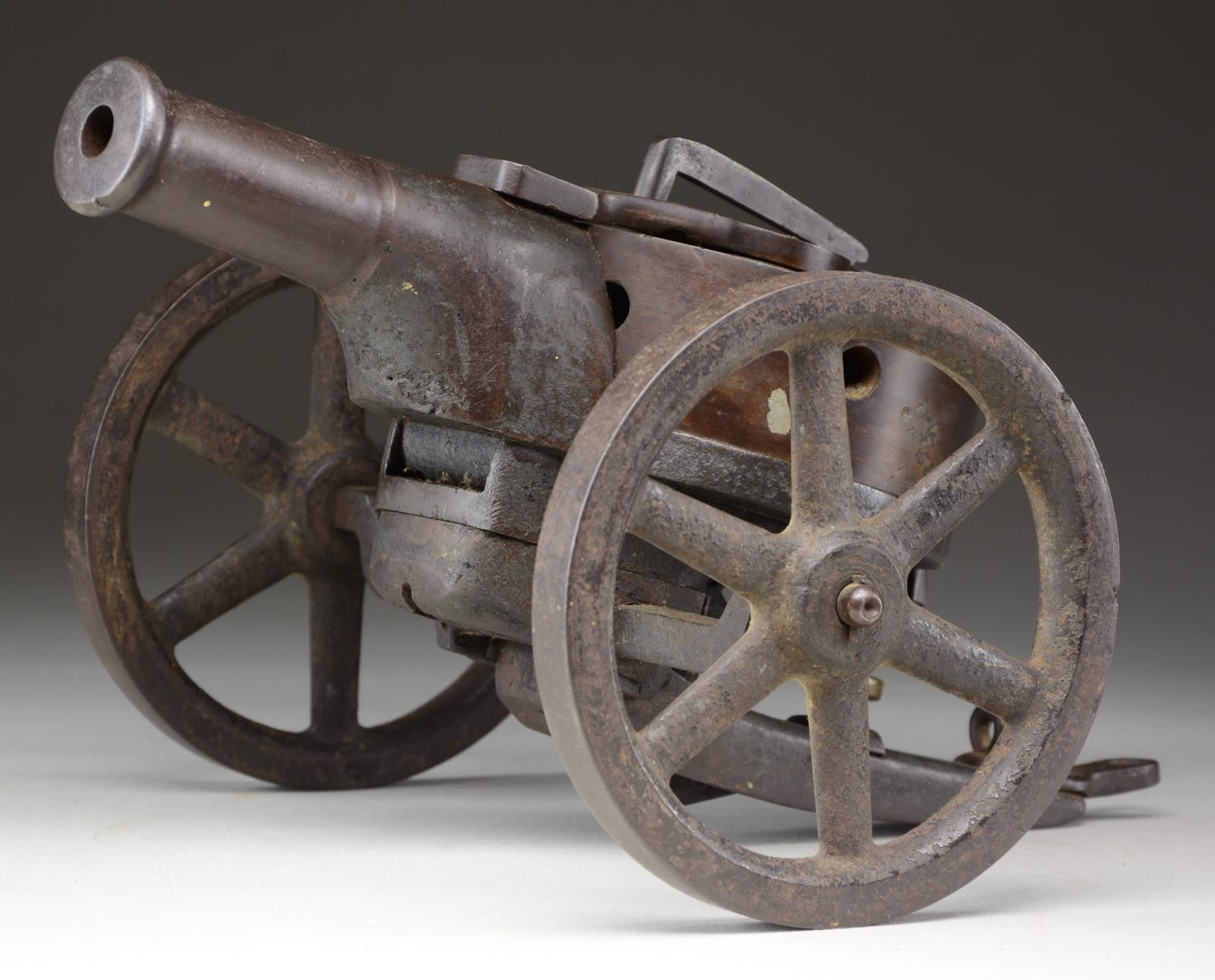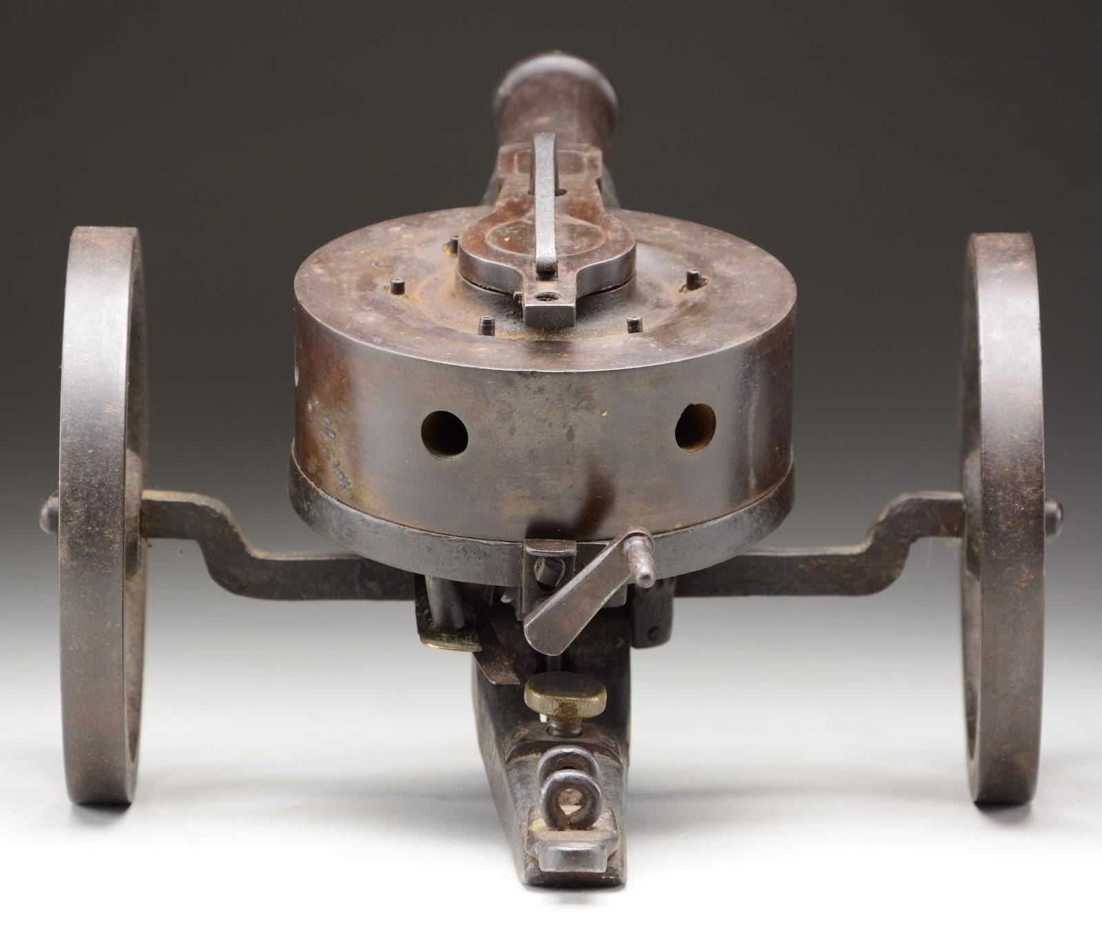 CANNON. PATENT MODEL OR DISPLAY PIECE? Cal. 52. NSN. In 1834, John Webster Cochran of Enfield, NH patented a repeating cannon or firearm that utilized a revolving horizontal turret to fire multiple shots. The story is that the next year he demonstrated a model to many possible European buyers. The Turkish minister was impressed and persuaded Cochran to exhibit his cannon to the Sultan, who had Cochran build a full-size 12-pounder. After being rewarded by the Sultan, he returned to America and worked with the C.B. Allen factory to build the now quite rare turret rifle and pistol. Cochran went on to patent many other firearm-related inventions. Is this firing model cannon the one originally built and exhibited by Cochran? It has a 6" smooth bore barrel that is fed by a 5 1/2" diameter six-shot turret. Each chamber would be muzzle-loaded and fired by percussion caps. The hammer is mounted on top. Although the mechanism is not complete, it appears that turning a crank at the rear causes the turret to rotate and somehow trip the hammer. The horizontal field of fire is set by a lever that engages a rack under the turret. Elevation is controlled by a brass knob on the trail. Cannon shows very fine workmanship with cast and machined parts. Other parts are hand-forged. CONDITION: cannon presently does not fire. All the metal is dark brown patina, but the carriage and wheels show a considerable amount of original gray paint. An intriguing small cannon worthy of considerable further study. The consignor states that this very cannon is pictured in the "Stagecoach Museum Gun Collection" catalog on page 204. (01-24663/MGM). ANTIQUE. $2,000-3,000.