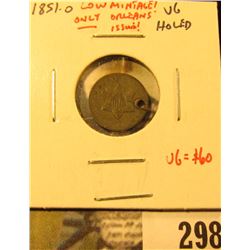 298 - 1851-O 3 Cent silver, VG holed, tough, low mintage issue, ONLY New Orleans issued 3 cent piece, valuMckee Coins Inc.