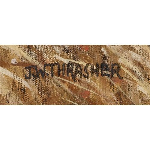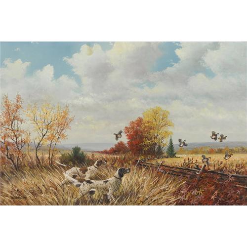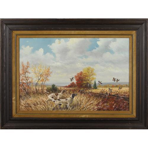 <B>J. W. THRASHER (b. 1940)</B></I><BR>Untitled Bird, Dogs, and Bob White<BR>Oil on canvas<BR>24in. x 36in.<BR>Signed lower left<BR><BR>J. W. Thrasher, the son of W. R. Thrasher, is known for his wildlife and hunting scenes.<BR><BR>Provenance:<BR>Acquired by descent from the artist by the present owner<BR><BR> <B>Condition Report:</B> Excellent condition. Some yellowing of varnish. Period frame in excellent condition.<BR><BR><b>Shipping:</b> Requires 3rd Party Shipping (<a target="_blank" href="http://www.heritageauctions.com/common/shipping.php">view shipping information</a>)