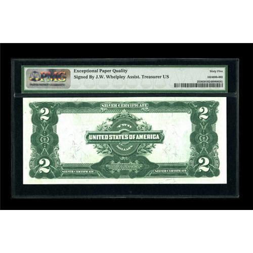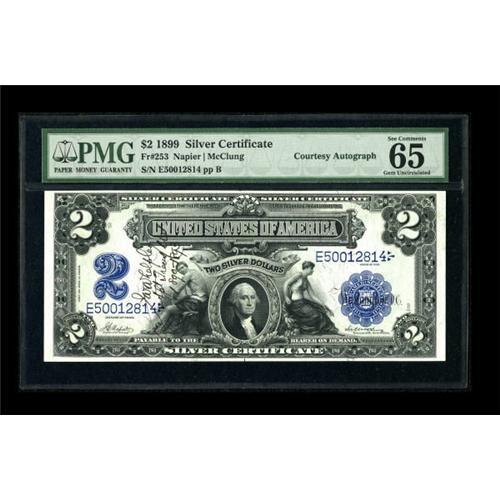 <B>J.W. Whelpley Courtesy Autograph Fr. 253 $2 1899 Silver Certificate PMG Gem Uncirculated 65 EPQ.</B></I> Dark blue ink and embossing are traits of this Deuce. Whelpley has added his position and years of service to his autograph. This is the plate letter B example and the second of only four notes that Whepley autographed of this Friedberg number.<BR><BR><b>Shipping:</b> Coins & Currency (<a target="_blank" href="http://www.heritageauctions.com/common/shipping.php">view shipping information</a>)