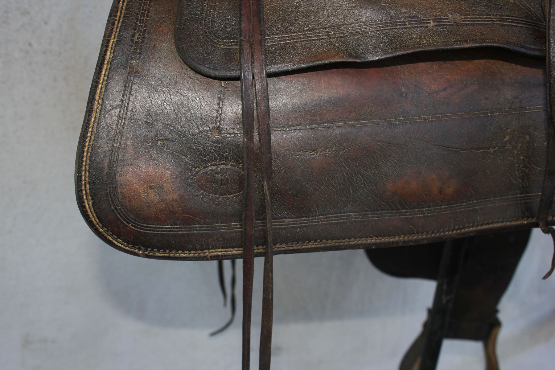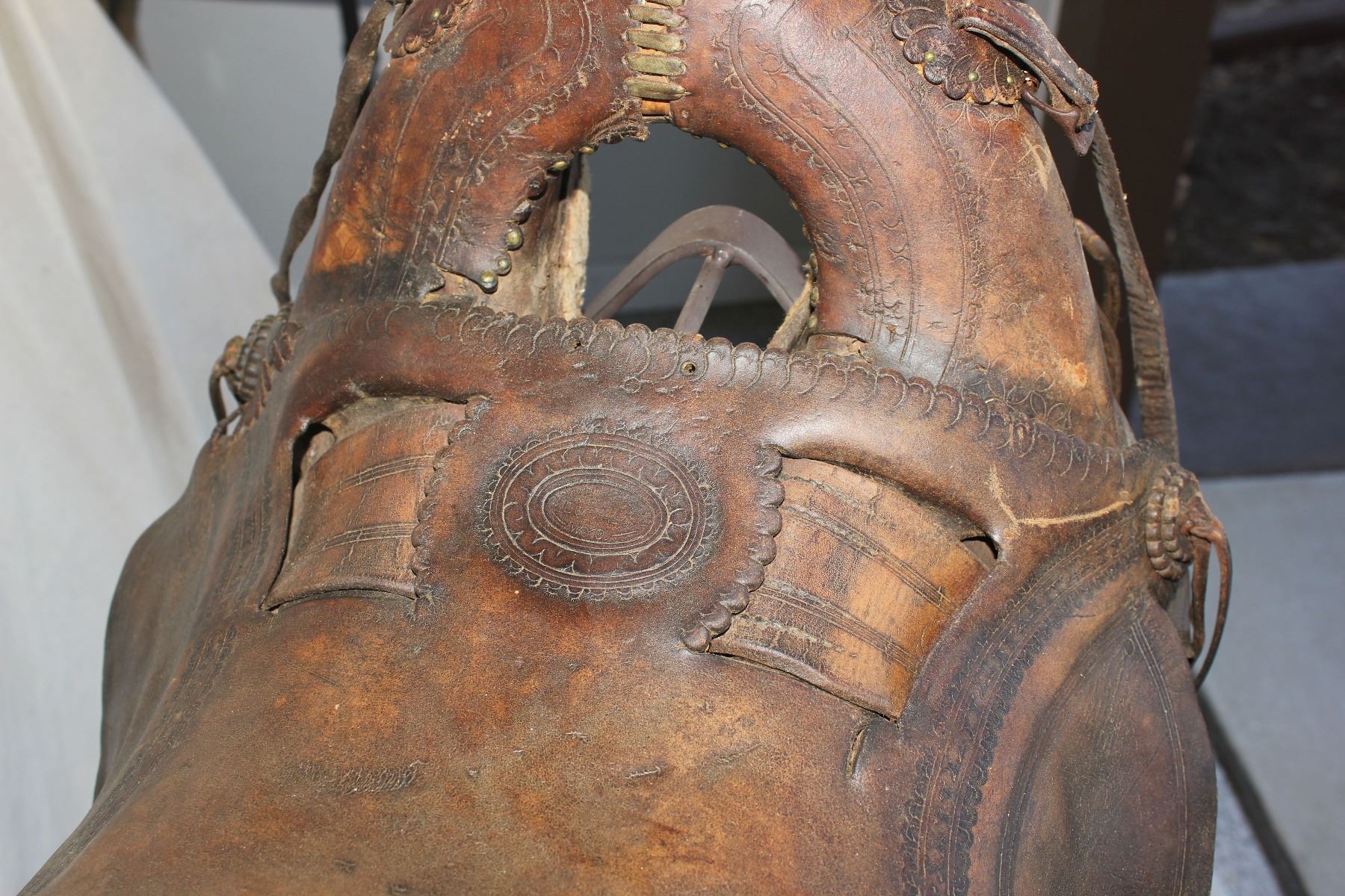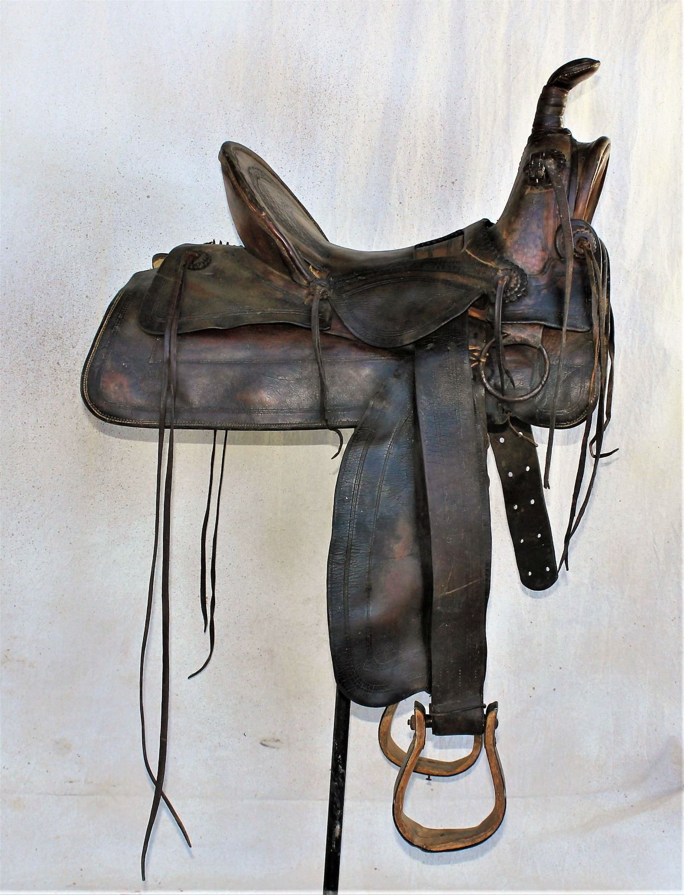 Very scarce early Wyoming made, slick fork, 15 1/2" loop seat saddle with border tooling, tall horn, radical 5 1/2" cantle, and three makers marks.