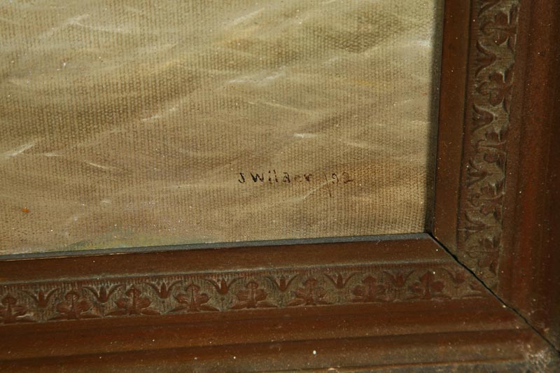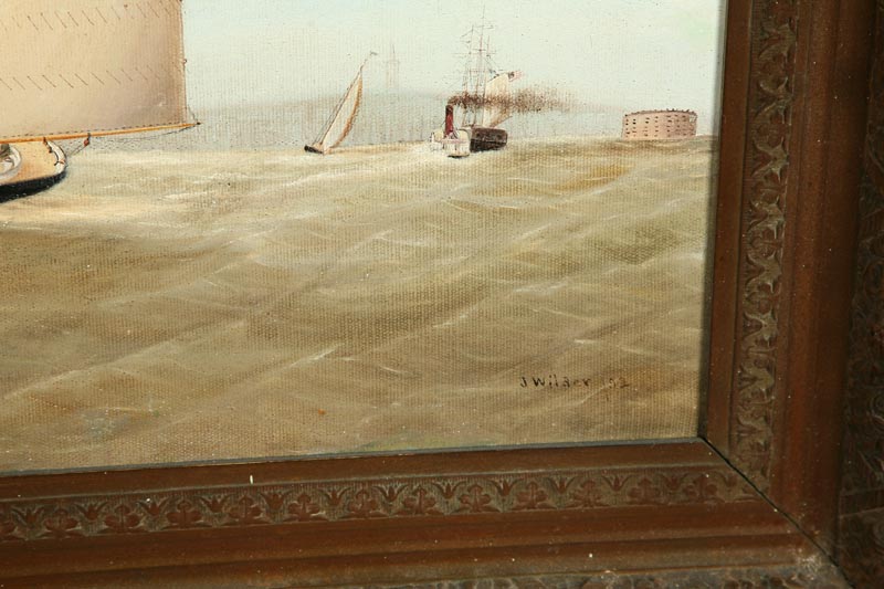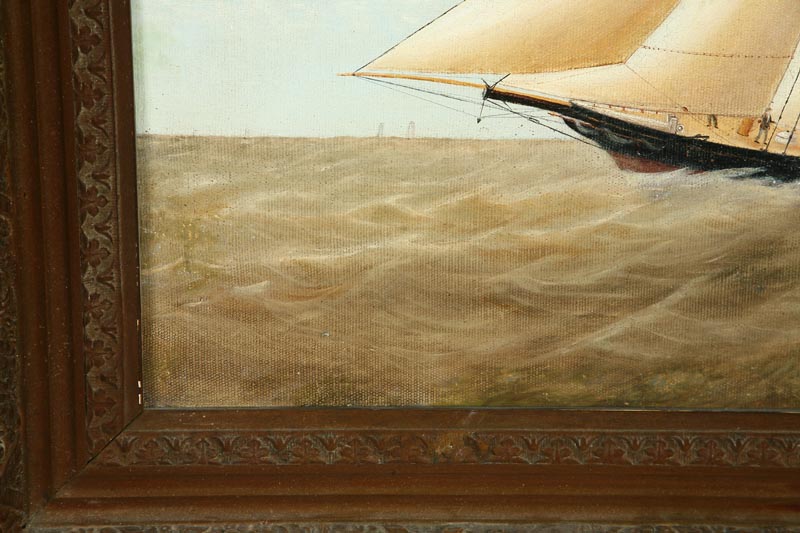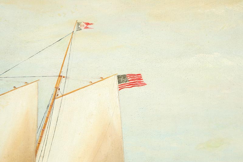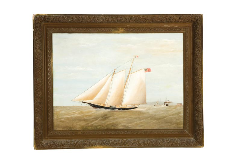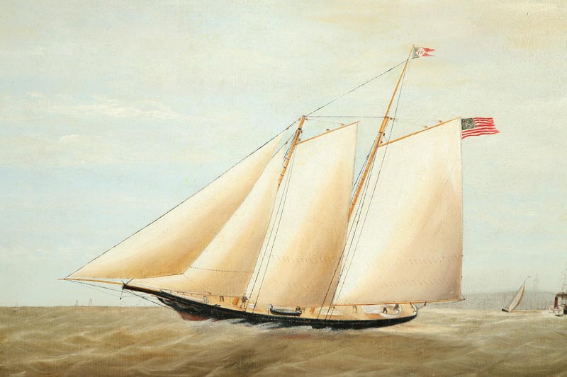 Oil on canvas, signed lower right and dated 1892. Fine portrait of a schooner with hands on deck and flying a U.S. yacht ensign. Behind is another sailing vessel and a steamship. Imperfections. 22"h. 30"w., in a period frame, 30"h. 37"w.