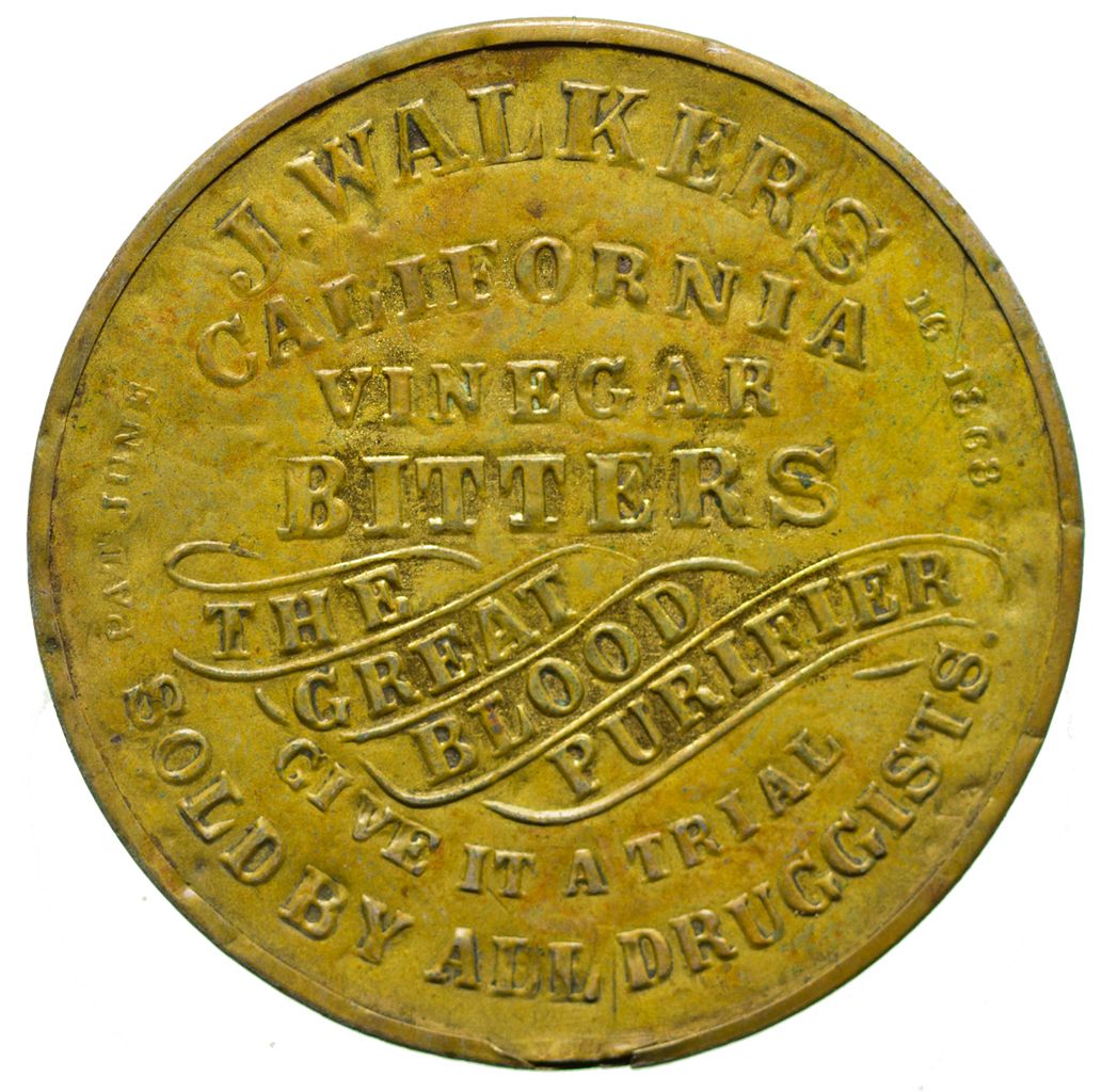 Golden cover, mirror broken. "J. Walker`s/ California/ Vinegar/ Bitters/ The/ Great/ Blood/ Purifier/ Give It A Trial/ Sold By All Druggists." 1.5" diameter. -40487