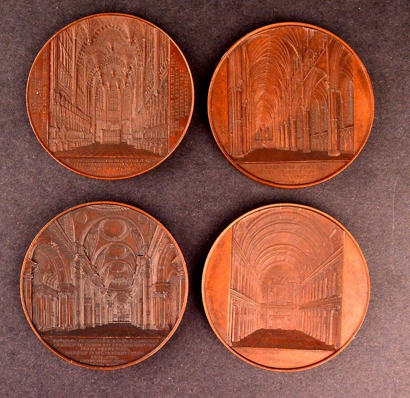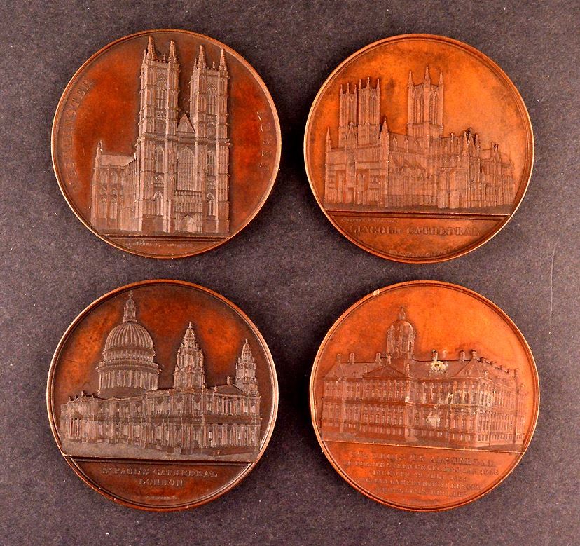 Medals by J. Weiner, from his popular Cathedral Series, Great Britain, Lincoln Cathedral; St. Paul's Cathedral; Westminster Abbey; Netherlands, Stadhuis Te Amsterdam; Ae, 60mm, 1 or 2 with edge bumps, Good VF. Total of 4 medals.
