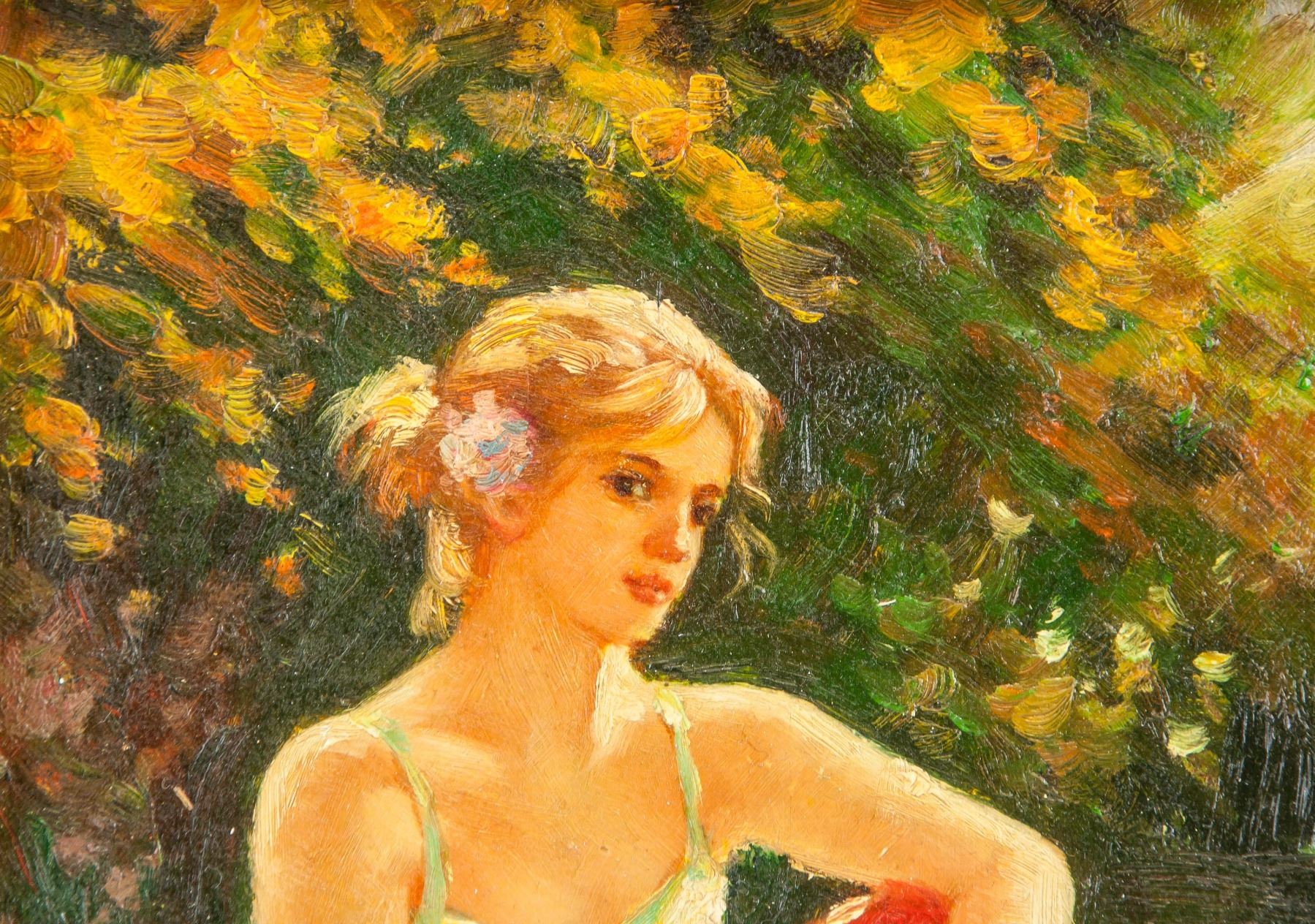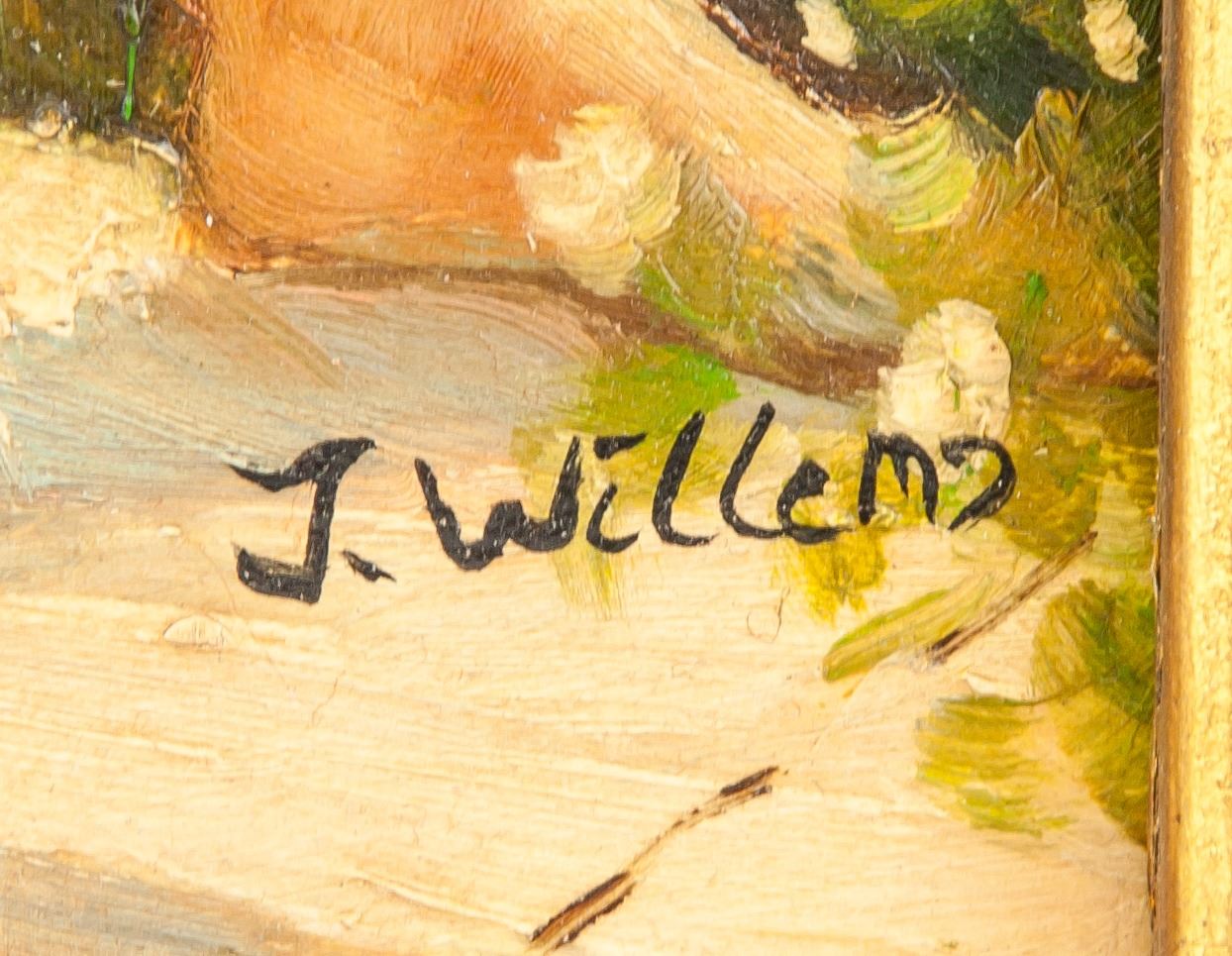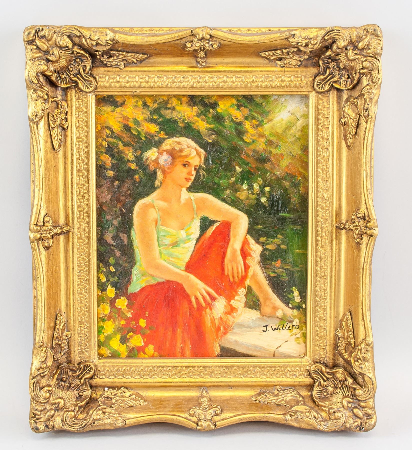 Oil on board, framed, featuring young lady under sunshine, signed J. Willems (German, 20th Century) on lower right corner. 9.5 x 7.5 in (24.1 x 19.1 cm). PROVENANCE: Private collection, North York, ON