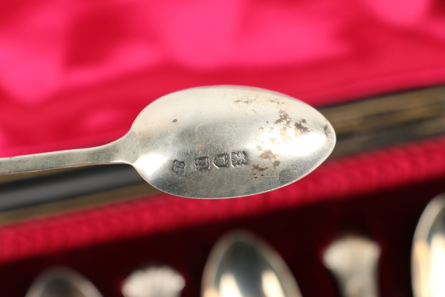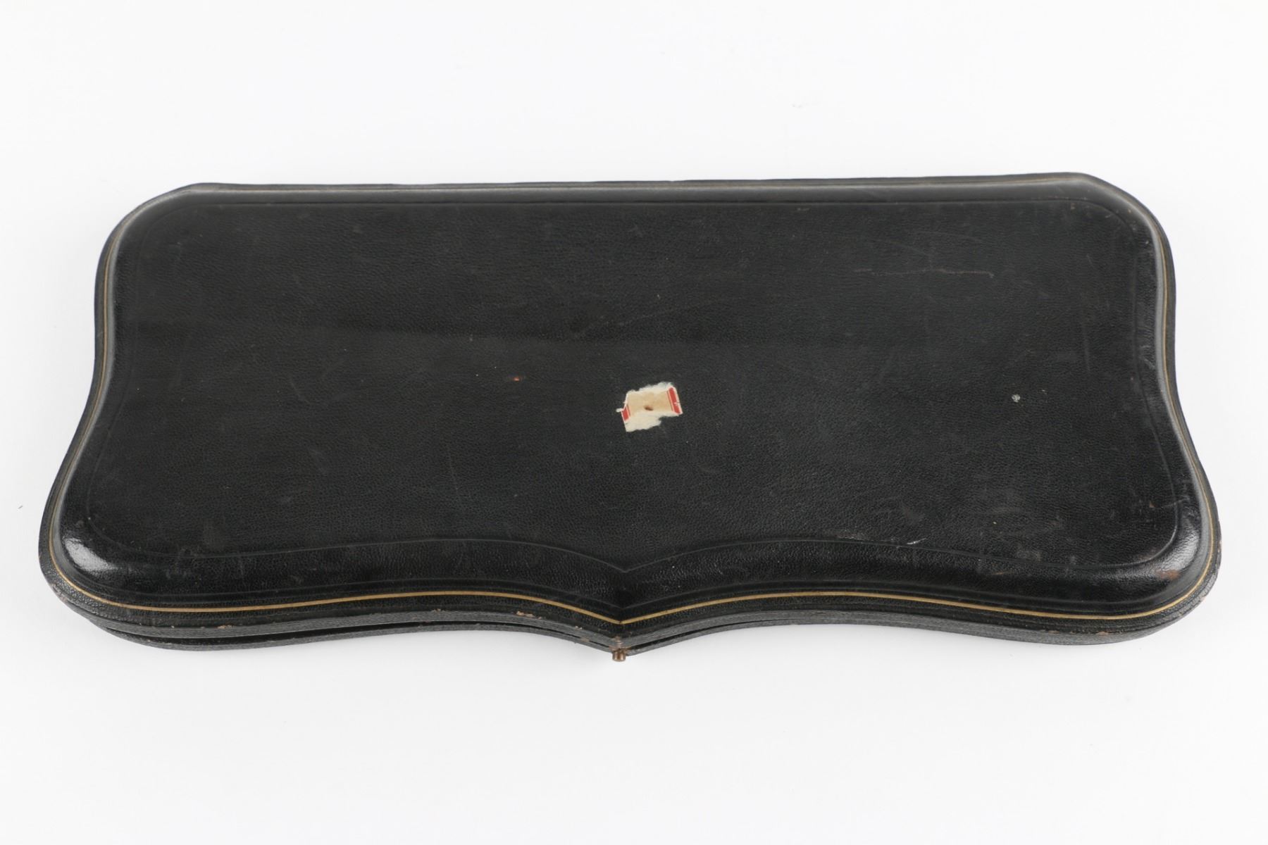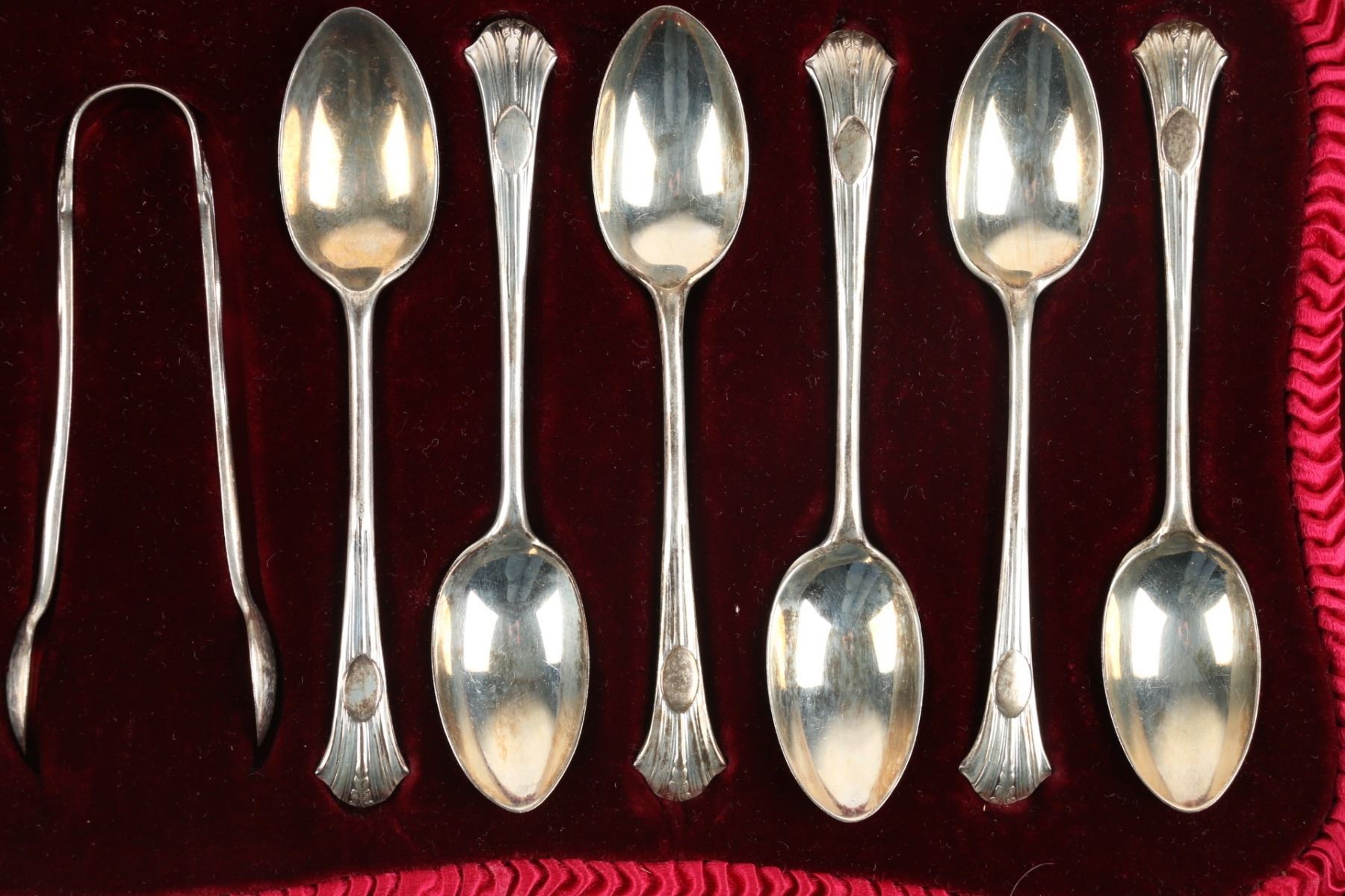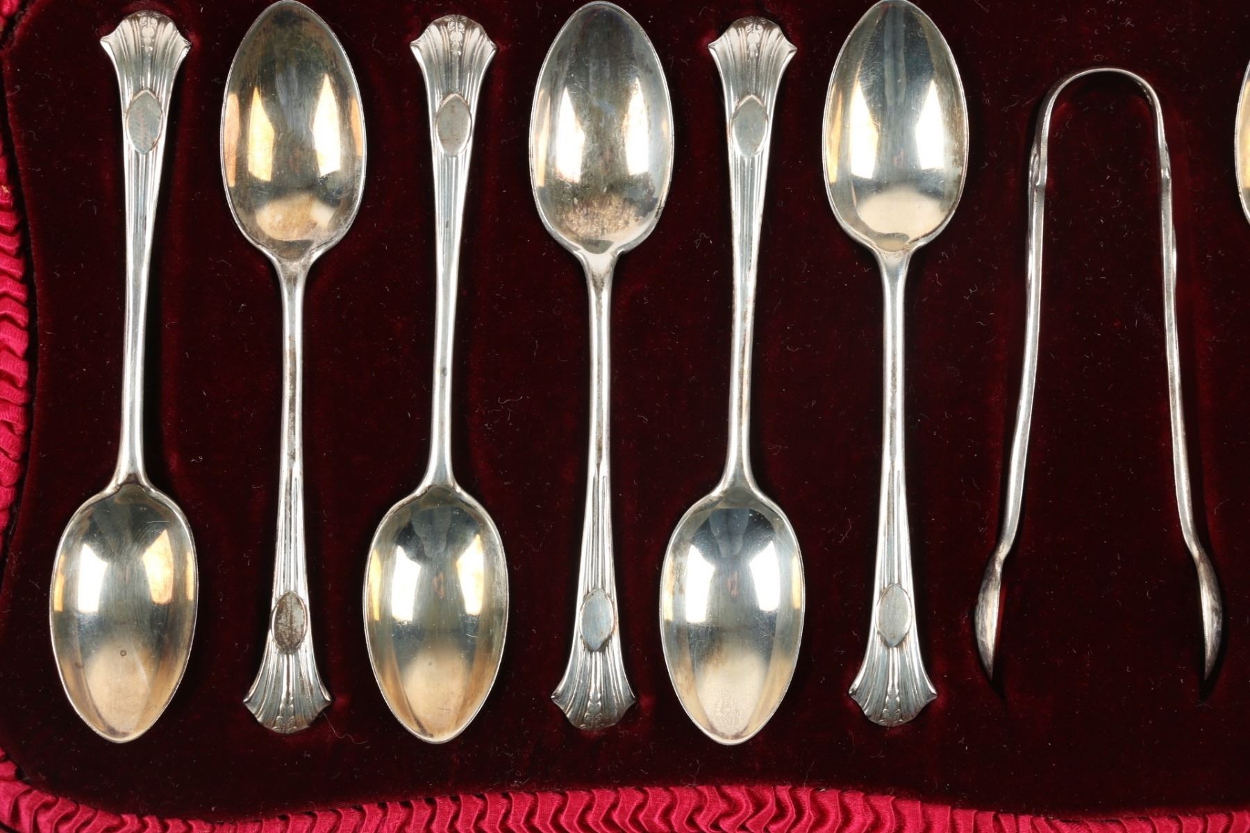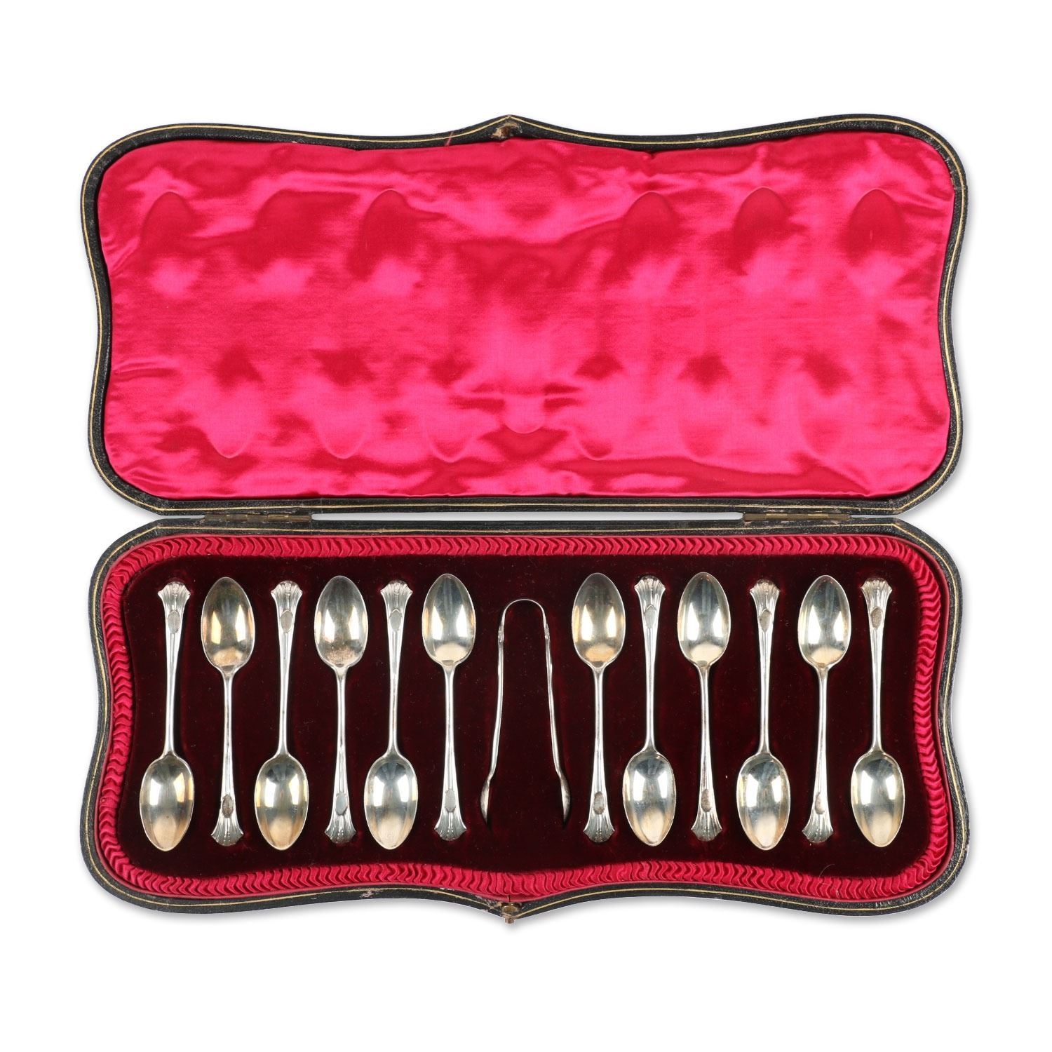 Lot 354 - Circa 1908. Thirteen (13) pieces. English. George Jackson and David Fullerton of Josiah Williams & Co. 1908, 12 spoons and sugar tongs. Gross weight, spoons and tongs 136g. Case 13" x 6" x 1". $100-200.