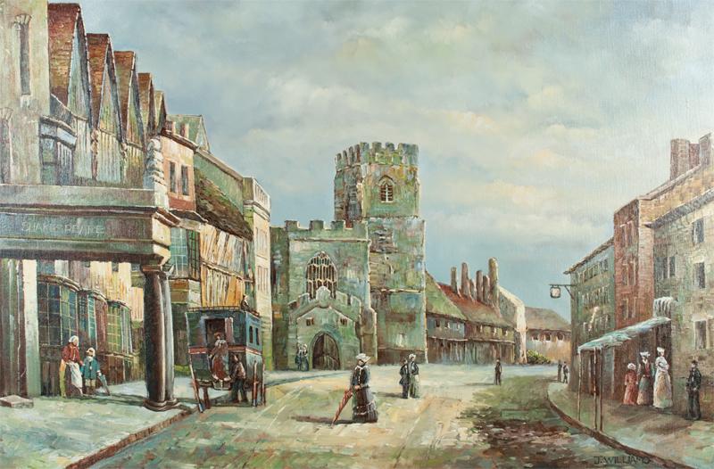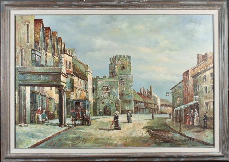 Depicting and english street scene with figures, the theatre sign with shakespeare playing, probably english, 24"H x 36"H, sight, signed lower right, circa 20th century, very nicley done.