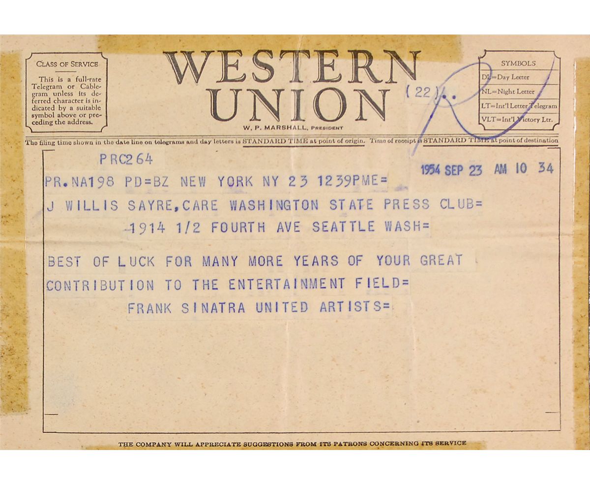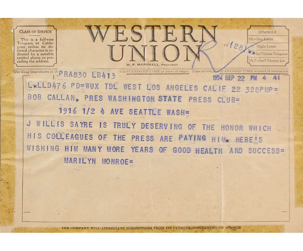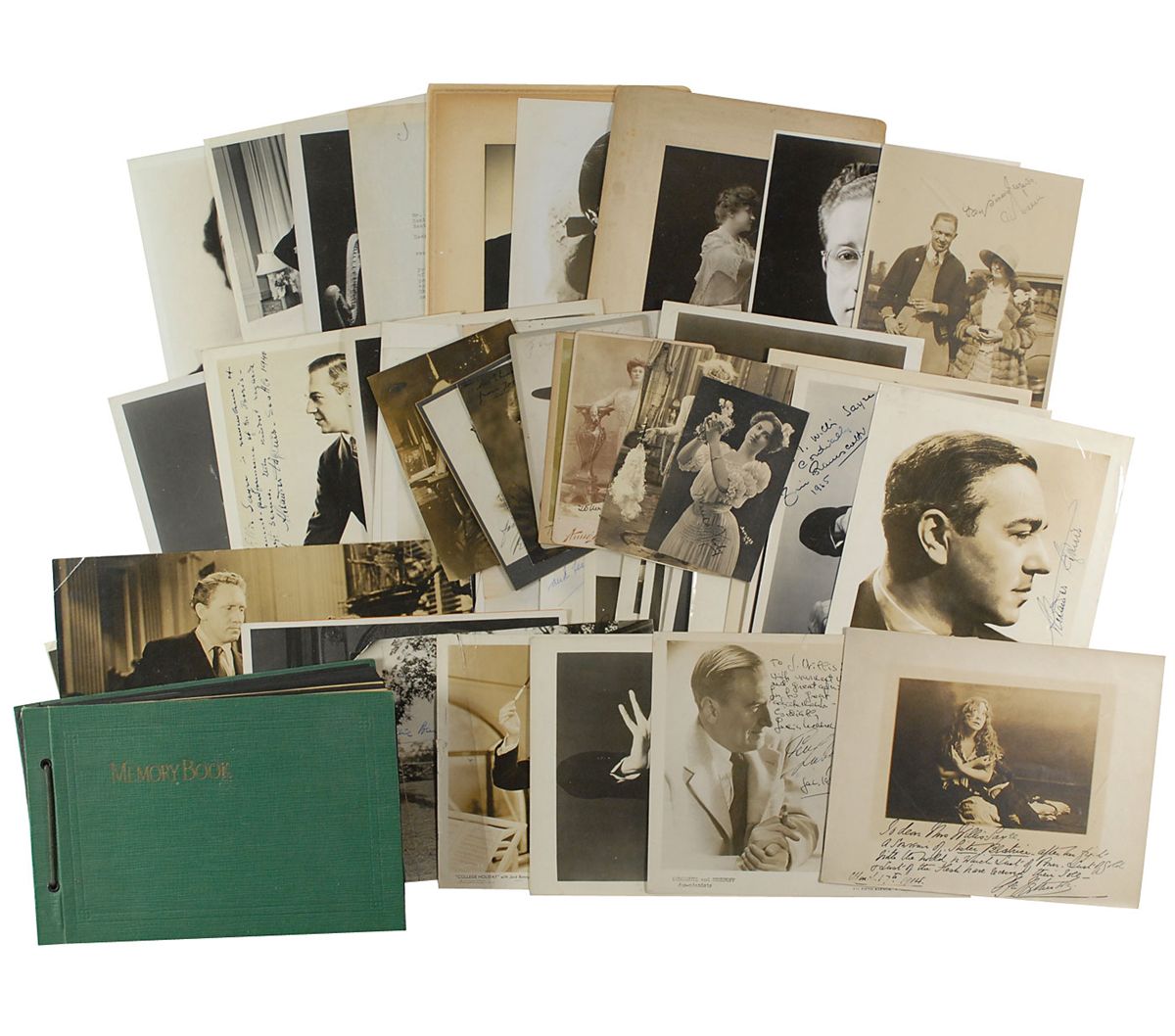 James Willis Sayre (1877–1963) was a Seattle arts critic and journalist who specialized in music and theatre. Impressive collection of items from the collection of J. Willis Sayre, consisting of over 40 signed photos, 50 telegrams, and 20 unsigned photos. Signed photos include: Larry Adler, Licia Albanese, Jack Benny, Billie Burke, Robert Casadesus, Ina Claire, Maurice Evans, Rose Eytinge, Zino Francescatti, Tito Guizar, Josef Hofmann, Maryla Jonas, William Kapell (3), Alexander Kipnis (2), Miliza Korjus, Andre Kostelanetz, Fritz Kreisler (2), Frank La Forge, Pierre Luboshutz and Genia Nemenoff, Kathryn Meisle, James Melton (2), Gaetano Merola, Grace Moore, Patrice Munsel, Conrad Nagel and Irene Hervey, James Neill, Lillian Nordica, Eugene Ormandy, Ezio Pinza, William Primrose, Eleanor Steber, Alfred Wallenstein, and Clara Kimball Young. TLSs are from Lou Smith and Michael Todd. Unsigned photos include Enrico Caruso, Katharine Hepburn and Spencer Tracy, Mickey Rooney, Artur Rubinstein, Geraldine Farrar, Rudolph Valentino, Lucrezia Bori, Richard Bonelli, and Claudia Muzio. Concluding the collection is a scrapbook of telegrams to Sayre from many of the biggest stars of the 1950s, including Marilyn Monroe, Frank Sinatra, Irving Berlin, Rosalind Russell, Rock Hudson, Jane Russell, Susan Hayward, Bette Davis, Ava Gardner, Ginger Rogers, Hedda Hopper, William Holden, Darryl F. Zanuck, Edward G. Robinson, and Barbara Stanwyck, many of whom comment on their work. In overall very good to fine condition. An exceptional collection of autographs and ephemera that traces the entertainment world in America for the entire first half of the 20th century.