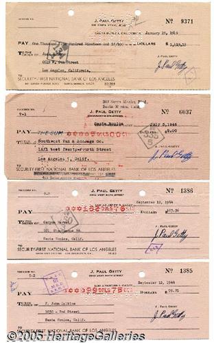 <B>J(ean) Paul Getty Lot of Nine Signed 1940s Checks</B></I> Entrepreneur, art collector and founder of the Getty Oil Company, J. Paul Getty (1892-1976) led an interesting, reclusive but not always happy life. Married and divorced five times, his relationships with his five sons were often strained. Here is a fine collection of nine signed checks on his personal account all dated in the 1940s (1944-49). Signatures are all in dark ink and none are affected by cancellations. Each check is approximately 8.25" x 3.25" (a couple slightly larger) and are made payable to various companies and individuals (even multi-millionaires had to pay the grocery bill!). <I>Accompanied by COA from PSA/DNA.</B></I>
