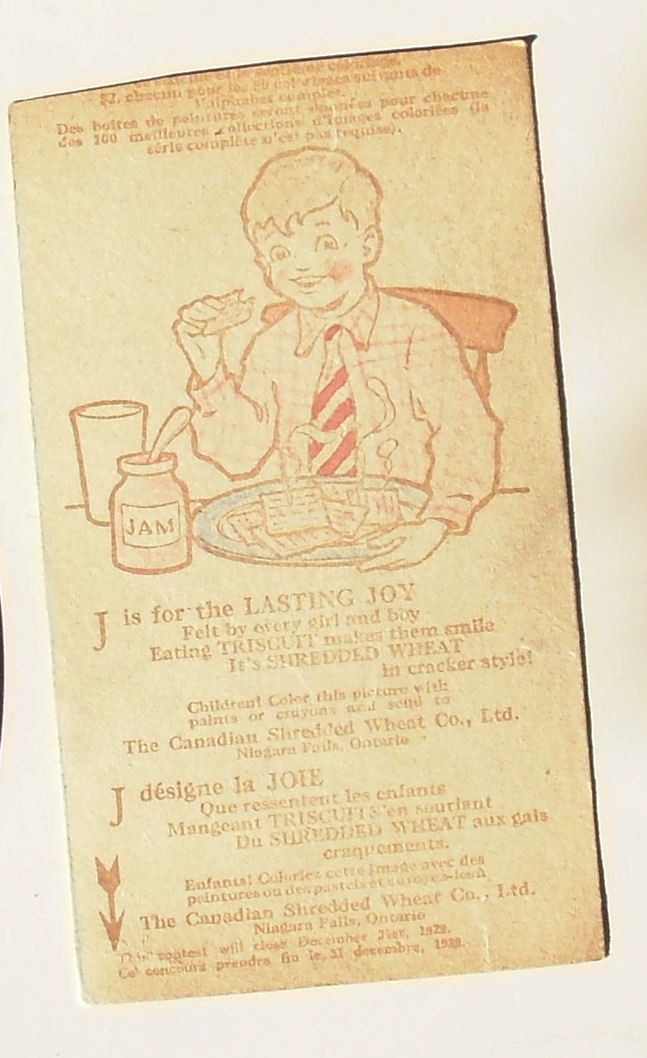 "J is for JOY", "J est pour la JOIE", like a postcard is this educational advertising so very scarce and eminent historical co and Canada item which was in a cereal 'Shreddies' Canadian Shredded Wheat box, this one someone coloured brilliantly as an expert; great Canadien / Canadian cuisine as jam (Home Made by Mother) is needed too for good health in 2015 for us all and not only children as a must... as noted "Je suis Charlie" for freedom of mind and body and culture... and to grow our OWN FOODS like strawberries, raspberries, gooseberries, currants, peaches, apples, etc. even in a city as well as in the country farms or orchards instead of building shopping centres or skyscrapers on them; Canadian Shredded Wheat Co. Ltd Niagara Falls, Ontario, Canada old card collectible advertising; none found on the internet, wow; since "In Canada, production began in 1939 at Lewis Avenue, Niagara Falls, Ontario", this could be as old as 1935 and likely included in the cereal boxes and you coloured it and mailed it so to try to win a PAINT BOX (I imagine an watercolour one with cakes (pigments) of different colours which was expensive then in those hard times days; as is, yellowed and still great surely for your collection or to start one now; combine this item with others too; even frame it as an historical item or artifact since it's like a postcard, plus in Francais (yes French) as well as in English which are both the official languages of Canada which you can practise this year too alone or with others !!!