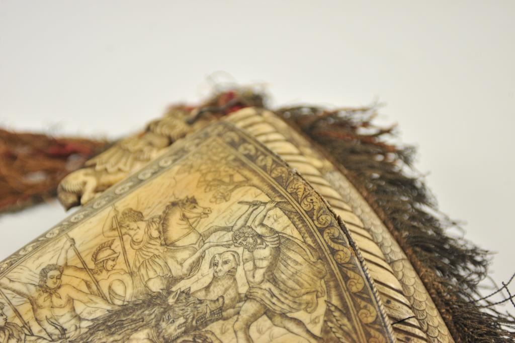 Jägermeister’s flask constructed from shoulder bones of oxen and completely carved in ancient scenes showing chariots, game, mythical beasts and demons. Finely carved figures of beasts hold rings for a carrystrap. The spout is carved with a boar’s head with matching fringe and strap. The condition is very good showing minor aging and discolorations. Measuring 21” x 13”, this is the most elaborately decorated andbest quality of the three illustrated examples we could find in research books. Circa 17th-19th Century from the area of Central Europe, probably Germany. Visually dynamic, the flask would make an impressivewall hanging suitable for a sophisticated European Arms or museum collection. Est.: $5,000-$10,000.
