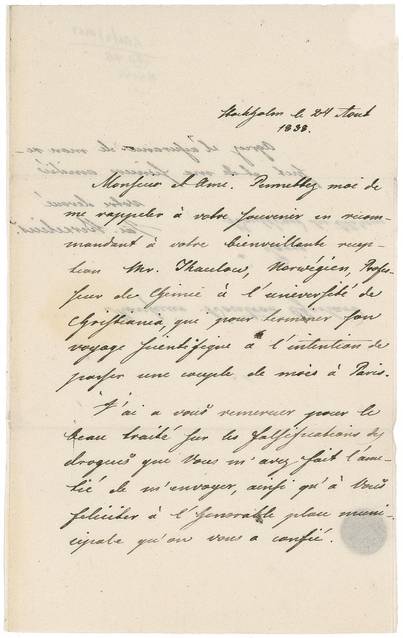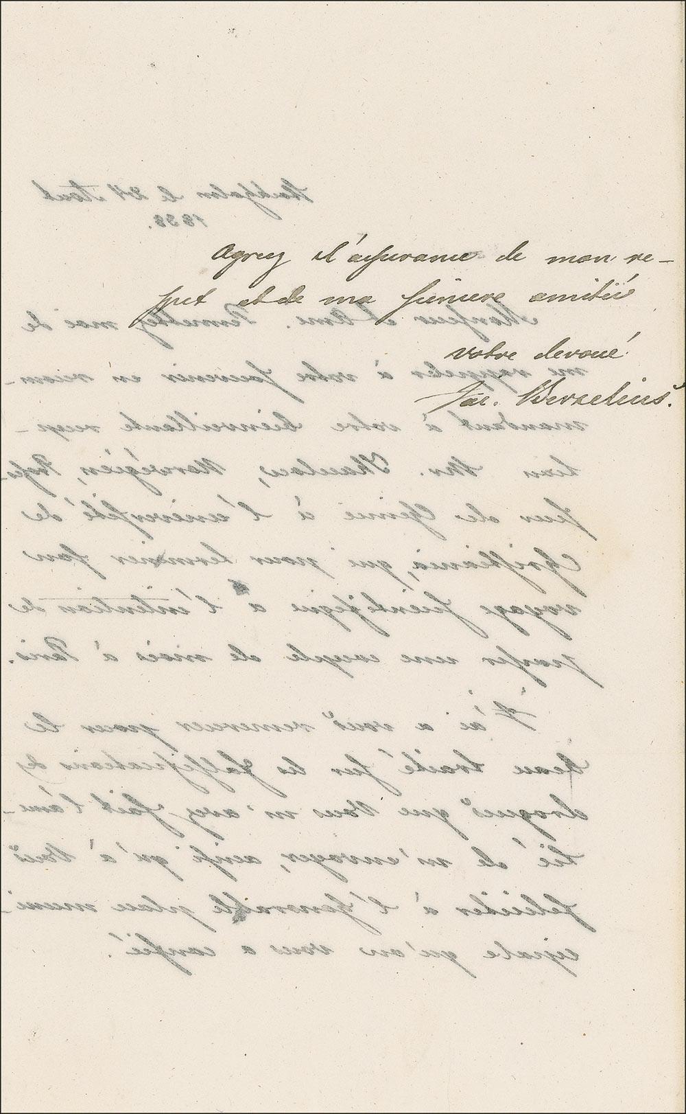 Swedish chemist (1779-1848). He worked out the modern technique of chemical formula notation and is considered a father of modern chemistry. ALS in French, signed “Jön Berzelius,” one onionskin page both sides, 5 x 8.25, August 24, 1838. Letter of recommondation to chemist Antoine François Boutron-Charlard in Paris In part (translated): “Allow me to recall to your memory in recommending your kind reception Mr. Thaulow, Norwegian, Professor of Chemistry at the University of Christiania, which to finish his academic visit intends to spend a couple of months in Paris. I have to thank you for the beautiful treatise on adulteration of drugs than you did me the friendship of me and to congratulate you on the honorable municipal plan that has given you …” In fine condition, with light show-through from writing on opposite sides, some light wrinkles, and slight paper loss to second integral page.
