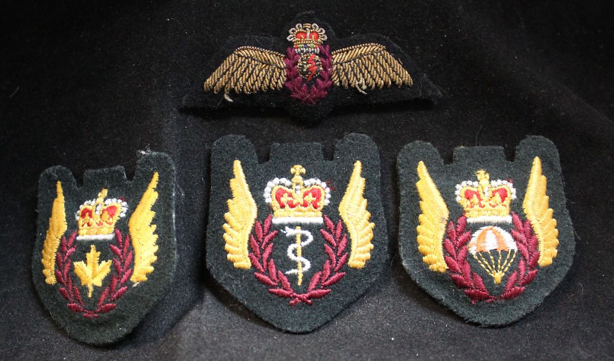 Lot of 4. 1 - Mess dress, aged Gold wire with colored thread, on black, red Lighting bolt centre on Globe design. Black cloth backing. 3" wide. 3 - Trade patches, Type with yellow side wings ending near bottom side of wreath, one - Yellow Maple Leaf centre, one - Orange and white parachute and one - White snake on yellow staff, all on black with black cloth backing.