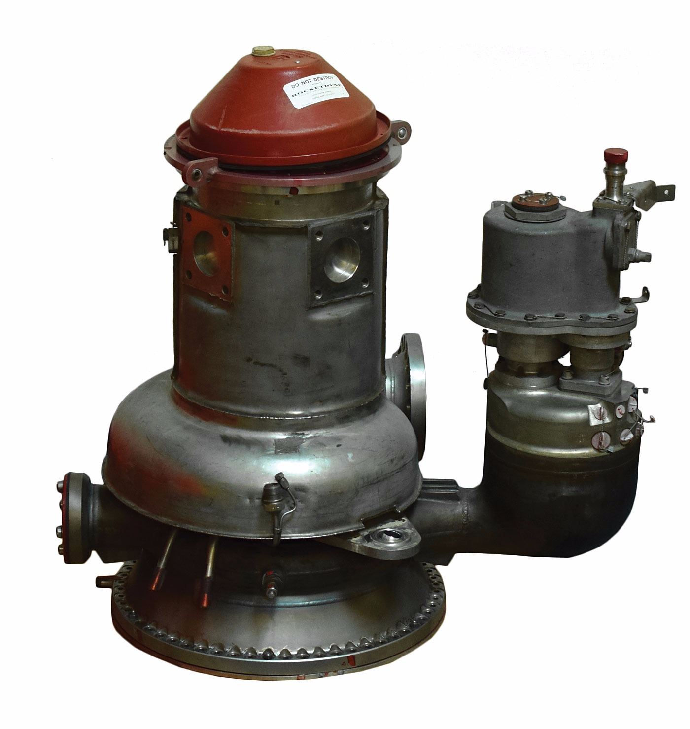 Rocketdyne J-2 Fuel Turbopump Assembly used on the Saturn IB and Saturn V launch vehicles. The assembly approximately measures 31 x 31 x 20.5, and features its original rubber Rocketdyne protective cover, “Install 2 Units, Desiccant Each Side, RX–20714,” clear plastic hexagonal desiccant container, and pair of “Do Not Destroy” labels. Turbopump side bears an affixed metal parts label: “Rocket Engine Component, Turbopump Assy Fuel, Contract No. 9015, Part No. 460160–51, Serial No. 4078255 CAL1516, Model No. J–2.” Underside of upper section bears two stamp-dated part numbers: “457441–23, F 0279 11–10–64” and “457441–21, F 1159 2–5–65.” Extending “Igniter A” topped with control valve, “RT NO 308040, SP, ER NO 4082827,” with lower portion featuring numerous vent plugs for “Igniter,” “Oxy Valve,” and “60–S,” and engraved with part number: “308360 13, SN 8805463, 308360 11, SN 4090405, 02602, 43999, 11–APR–67, MR197578.” Assembly features yellow identification spray paint and several original Rocketdyne protective plugs. In fine condition, with expected wear from use.