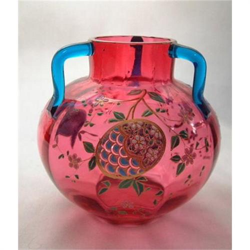 <table width="100%" border="0" cellspacing="0" cellpadding="4"><tr><td><em> </em></td></tr><tr> <td width="100%"> This is most likely attributed to Jean Auguste. It is a three-handle cranberry bulbous vase. It measures 5 3/4" tall and is 5 1/4" across. It has three shapely blue handles. Between each handle, on the side of the vase, there is a different large polychrome design. Also scattered entirely around the vase are multi-colored enamel flowering. There is plenty of aging on the bottom of the vase. This is circa 1875-1885. Perfect condition. </td></tr><tr> <td> </td></tr><tr> <td>Reference #: JA2</td></tr><tr><td>Condition:Perfect</td></tr><tr><td>Year:1875-1885</td></tr><tr><td>Title:JA2</td></tr><tr><td>Location:New York, New York</td></tr></table>