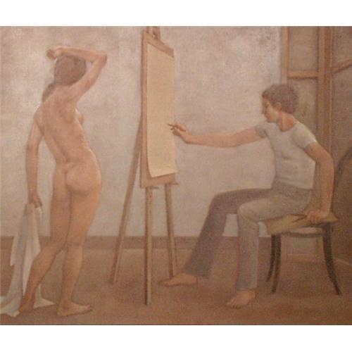 Here?s a beautiful oil on canvas of an artist painting his model by American artist, Jack Henderson. The image measures 22 1/2 by 26 1/2 inches. Unsigned. Very Good Condition. Framed. Framed size is 26 by 30 inches.<p>