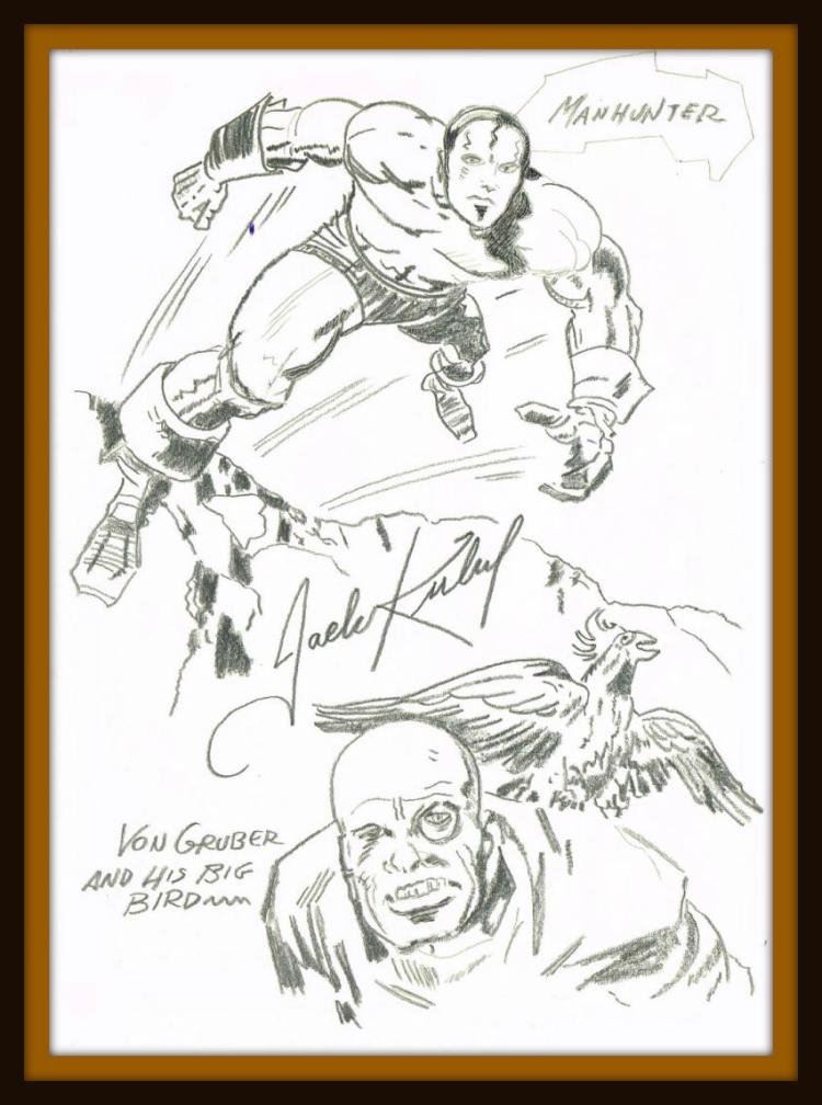 JACK KIRBY: MANHUNTER AND VON GRUBER. Hand drawn and Signed by Jack Kirby. Jack was an American comic book artist, writer, and editor widely regarded as one of the medium's major innovators and one of its most prolific and influential creators. Professionally mounted and framed in wood. Condition Report: Very good. Provenance: Supplied with coa. Condition Report: Very good.