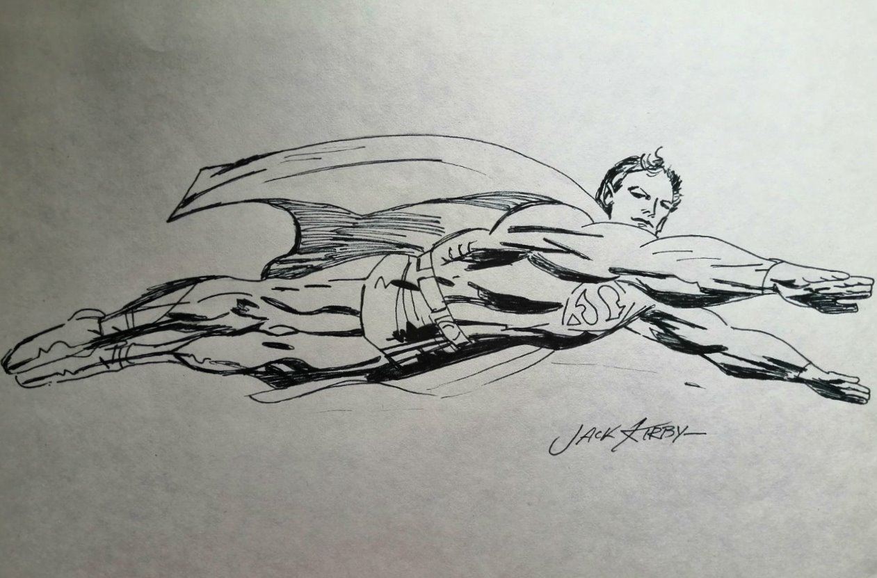 This drawing is of Superman flying through the sky by Jack Kirby, signed. Stamped on back Cossio Art gallery and supplied with coa.