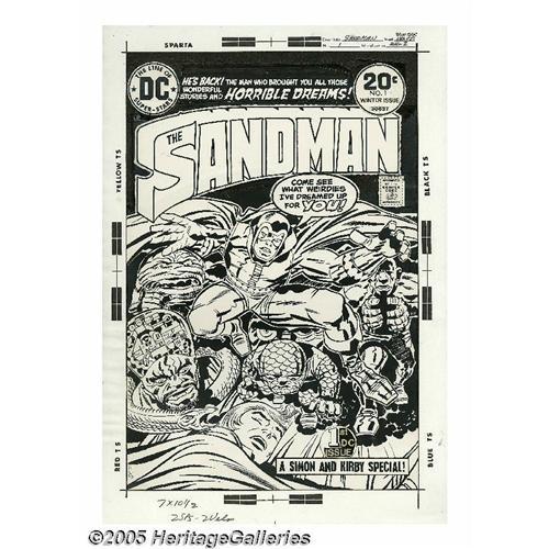 <B>Jack Kirby and Mike Royer - The Sandman #1 Cover Stat (DC, 1974).</B></I> Originally scheduled as a one-shot, Joe Simon and Jack Kirby reunite for a last collaboration with this revamp of the Sandman. Speculators drove the sales of this single issue up so high that a series was scheduled. Simon and Kirby's " "<B>Sandman</B></I> was an otherwise unnamed hero who operated out of a place called the ""Dream Dome,"" and was assisted by two grotesque ""nightmare monsters"" named Brute and Glob. This insomnia-charged cover is not original art, but ""photo-ready""cover stat/paste-up art used to print this issue. The image area measures 10"" x 15"" and the work includes the original logo and masthead paste-up art. There is some slight water damage to the extreme left edge, outside of the image area, otherwise this photostat layout is in Excellent condition. <BR><BR><B>Important notice:</B> Heritage usually auctions material at the rate of 200-250 lots per hour. On some occasions eBay Live bid software or the Internet may not be able to keep up with the pace of the auction. We recommend placing a realistic absentee bid now as insurance to avoid disappointment. Occasionally the auctioneer may eliminate or reject an eBay Live bid, and the auctioneer may also reopen a lot after the close of the eBay live bidding (usually because we missed an audience bid), and may reject your bid even if it shows you as the winning bidder. By bidding via eBay Live, you agree that Heritage may award the lot to another bidder at its sole discretion under the circumstances described above or any other reasonable circumstances. Since eBay bids are not shown to us until we open the lot on the floor, we treat those bids just like floor bids. In most cases the floor responds before the eBay bid is presented to us, due to Internet lag time, so for consistency we have made it a policy that floor bids are always considered first over tie eBay live bids. Also please note that all Heritage lots purchase