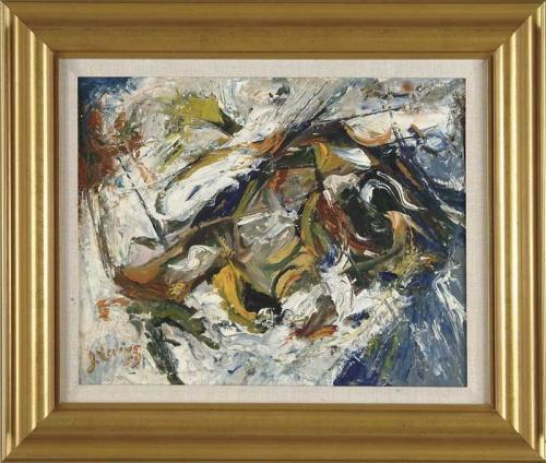 JACK LEVINE (American, 1915-) ABSTRACT COMPOSITION. Colorful oil on board scene with broad brush strokes. Signed lower left "J. Levine 59". Housed in a ogee style gilt replacement frame. SIZE: 16" x 20". CONDITION: Very good. 9-27328